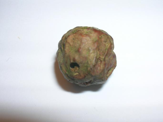 Keywords: Andricus lignicola - the Cola-nut gall.JPG en A Cola-nut gall showing the exit hole of the gall wasp Spier's Beith North Ayrshire Scotland Own Rosser1954 Roger Griffith 2008-12-15 Andricus lignicola