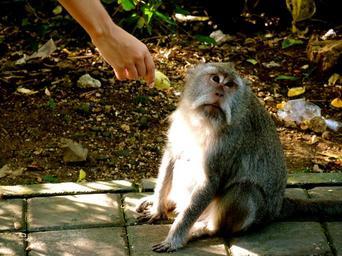 Keywords: animal ape monkey looking banana hand feeding cute bali wildlife primate