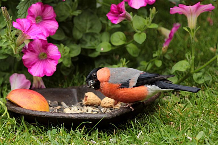 Keywords: animal bird bullfinch gimpel male pyrrhula garden lining plate spring