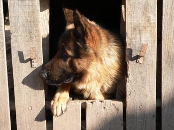 Keywords: animal dog is watching loyalty portrait german shepherd shed wood sunshine shadow