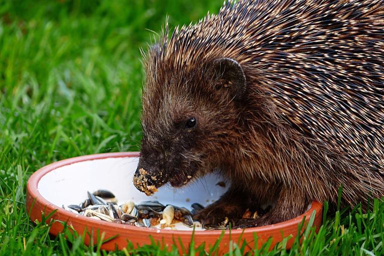 Keywords: animal mammal hedgehog erinaceus meal lining plate garden close