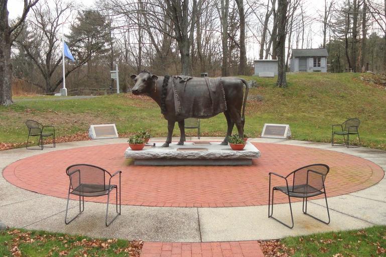 | Keywords: Animal Rights Memorial - Sherborn, Massachusetts - DSC02932 (cropped 2).jpg Monument called Sacred Cow Animal Rights Memorial in Sherborn Massachusetts The memorial is dedicated to Emily the Cow who died in 2004 <p> In 1995 Emily the Cow escaped from a slaughterhouse in Hopkinton MA by jumping a gate During her 40 days eluding capture Emily was aided by a sort of ad hoc underground railroad of townspeople She found lasting refuge at Sherborn's 'Peace Abbey ' and became a charismatic spokescow espousing a meat-free diet for humans She didn't talk but her huge eyes and friendly disposition inspired many who met her <p> When Emily died in 2004 her owners commissioned artist Lado Goudjabidze to sculpt a life-sized likeness to stand above her grave -- between statues of Mother Teresa and Gandhi Emily was buried in April 2005 and the statue was dedicated soon after on Earth Day <p> The statue is labeled as the 'Sacred Cow Animal Rights Memorial ' http //www roadsideamerica com/story/11766 Daderot 2012-01-02 11 04 03 Daderot cc0 File Animal Rights Memorial - Sherborn Massachusetts - DSC02932 JPG and File Animal Rights Memorial - Sherborn Massachusetts - DSC02932 cropped JPG This version was cropped and uploaded by SlimVirgin cc0 Monuments and memorials in Sherborn Massachusetts Monuments and memorials to animal rights |
