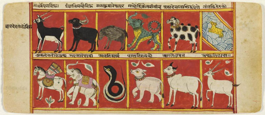 | Keywords: Animal Symbols of the Kings of the Twelve Heavens of the Vaimanika Gods.jpg  en Indian and Himalayan Art Animal Symbols of the Kings of the Twelve Heavens of the Vaimanika Gods Page from a manuscript of the Sangrahanisutra Made in Gujarat India or Rajasthan India 1663-64 Artist/maker unknown India Opaque watercolor on paper 4 3/8 x 10 inches 11 1 x 25 4 cm Currently not on view 1935-34-11 26 a Purchased with the Francis T S Darley Fund 1935 Label The complex Jain cosmology expounded in the Sangrahanisutra speaks of four classes of gods the highest of which are called Vaimanika flying because they travel in airborne chariots Each of the twelve Vaimanika gods has a complete heaven ruled over by a king Each king is represented by a different animal as depicted and named in this painting They are left to right top to bottom antelope water buffalo boar elephant-lion ram swimming spotted animal horse elephant snake rhinoceros bull and gazelle Social Tags 1663-64 http //www philamuseum org/collections/permanent/194969 html mulR 17986 37 unknown India PD-old-100 Uploaded with UploadWizard Animals in art of India |