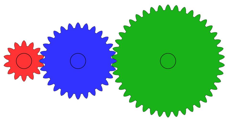 | Keywords: Animated 3 Gear Row Frame1.svg en Three gears z<sub>1</sub> 14 red ; z<sub>2</sub> 28 blue ; z<sub>3</sub> 42 green de Drei Zahnrädern z<sub>1</sub> 14 rot ; z<sub>2</sub> 28 blau ; z<sub>3</Sub> 42 grün <br /> Antrieb links Abtrieb rechts<br /> i<sub>Stufe1</sub> z<sub>2</sub> / z<sub>1</sub> 28 / 14 2<br /> i<sub>Stufe2</sub> z<sub>3</sub> / z<sub>2</sub> 42 / 28 1 5<br /> i<sub>Ges</sub> i<sub>Stufe1</sub> · i<sub>Stufe2</sub> z<sub>2</sub> · z<sub>3</sub> / z<sub>1</sub> · z<sub>2</sub> z<sub>3</sub> / z<sub>1</sub> 42 / 14 3 2016-12-11 own Jahobr other versions <gallery caption> File Animated 3 Gear Row gif animated GIF version </gallery> cc-zero Jahobr v fl Code is given in the animated version File Animated 3 Gear Row gif Drawings of gears and gearboxes Blue green red |