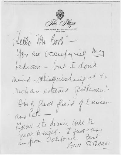 | Keywords: Ann Sothern Note - NARA - 193971.jpg Scope and content Note from Ann Sothern to Robert F Kennedy General notes 193971 Local identifier Kennedy Robert F Robert Francis 1925-1968 John F Kennedy Library NLJFK Columbia Point Boston MA 02125-3398 Record group Collection JFK-RFK Robert F Kennedy Papers 1937 - 06/06/1968 Record group ARC 1169 Robert F Kennedy Papers Attorney General Papers Personal Correspondence compiled 1960 - 1964 Series ARC 193954 File unit Robert F Kennedy Papers Attorney General's Files Personal Correspondence VIP 1963 - 1964 1963 - 1964 File unit ARC 193966 Variant control numbers NAIL Control Number NLK-RFK-AGFILESPERCO-VIP1963TO1964-7BBBG Other versions <gallery> File Ann_Sothern_Note_-_NARA_-_193971 tif tif File Ann_Sothern_Note_-_NARA_-_193971 jpg jpg </gallery> NARA-cooperation PD-USGov Check categories-NARA 2011 September 19 Documents in English |