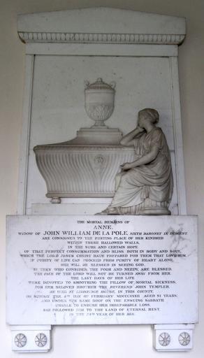 Keywords: AnneDeLaPole ShuteChurch Devon.jpg en 1832 mural monument to Lady Anne Pole nee Templer 1758-1832 wife of Sir John de la Pole 6th Baronet 1757-1799 signed P Rouw sculp London Peter Rouw 1771-1852 west wall of south transept of St Michael's Church Shute Devon Inscription The mortal remains of Anne widow of John William de la Pole sixth baronet in descent are consigned to the resting place of her kindred within these hallowed walls in the sure and certain hope of that perfect consummation and bliss both in body and soul which the Lord Jesus Christ hath prepared for them that love him If purity of life can proceed from purity of heart alone she will be blessed in seeing God If they who consider the poor and needy are blessed the face of the Lord will not be turned away from her The last days of her life were devoted to smoothing the pillow of mortal sickness for her beloved brother the Reverend John Templer He died at Lindridge House in this county on Sunday the 5th day of February MDCCCXXXII aged 81 years and under the same roof on the ensuing Sabbath unable to endure her irreparable loss she followed him to the land of eternal rest in the 74th year of her age own photo own photo 1832; photo Sept 2012 Wall mounted church monuments in Devon New Shute House Peter Rouw |