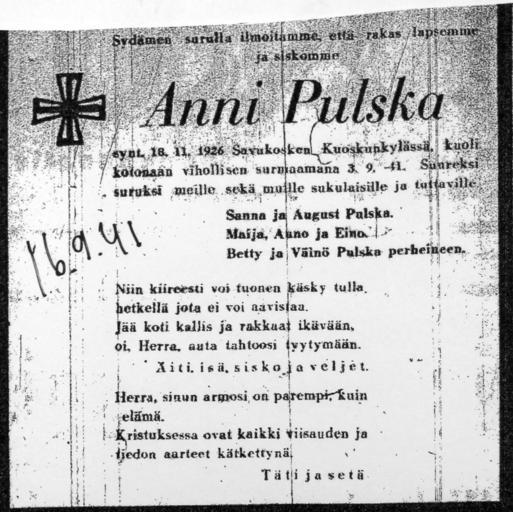 Keywords: pulska suvusto blackandwhite monochrome text writing outdoor sign plaque photo border black and white Lapin Kansa 16. 9. 1941 suvusto.fi/savukosken-haloset/#A18941101 Lapin Kansa 16. 9. 1941 suvusto.fi/savukosken-haloset/#A18941101