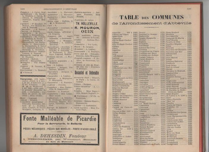 Keywords: Annuaire générale d'Abbeville en 1924, p 1196-1197 fin d'Yvrencheux à Yzengrmer + table de communes de l'arr. d'abb..jpg Annuaire général d'Abbeville 1924 - Pages 1196-1197 <br>Communes d'Yvrencheux fin à Yzengremer + table des communes de l'arr d'Abbeville <br>Mentions d'activités commerciales et artisanales en 1924 Yzengremer Fonderie de fonte A Dehesdin own 2007-11-25 Groteddy Abbeville Directories of Abbeville 1924 directories Vaux-Marquenneville in 1924 Yvrencheux Yzengremer Woincourt |