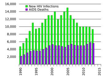 | Keywords: Annual Mexico AIDS deaths.svg translate yes en New HIV infections each year and AIDS deaths occurring during the year in Mexico; data from http //www unaids org/en/media/unaids/contentassets/documents/document/2014/2014gapreportslides/HIV2013Estimates_1990-2013_22July2014 xlsx UNAIDS GAP Report 2014 2014-10-19 own Delphi234 other versions cc-zero AIDS statistics AIDS in Mexico Uploaded with UploadWizard | ||||