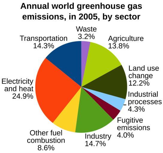 Keywords: Annual world greenhouse gas emissions, in 2005, by sector.svg en This pie chart shows annual world greenhouse gas emissions in 2005 by sector Emissions are measured as a percentage of total world carbon dioxide equivalent emissions Electricity and heat 24 9 Industry 14 7 Transportation 14 3 Agriculture 13 8 Land use change 12 2 Other fuel combustion 8 6 Industrial processes 4 3 Fugitive emissions 4 0 Waste 3 2 Emissions due to land-use change include both emissions and absorptions i e processes that both add to and remove carbon from the atmosphere Emissions due to land-use change are highly uncertain References citation Herzog Timothy July 2009 World Greenhouse Gas Emissions in 2005 WRI Working Paper World Resources Institute WRI http //www wri org/publication/navigating-the-numbers Washington DC USA p 2 Vectorization of File Annual world greenhouse gas emissions in 2005 by sector png created by User Enescot Enescot 2012-11-23 vectorized 2013-07-08 Data Data from Herzog 2009 are given below as comma-separated values CSV The data were exported from OpenOffice 3 4 1 Calc using the following options enclosed in braces Character set Western Europe Windows-1252/WinLatin ; Field delimiter ; text delimiter <pre> Sector Percentage Transportation 14 3 Electricity and heat 24 9 Other fuel combustion 8 6 Industry 14 7 Fugitive emissions 4 Industrial processes 4 3 Land use change 12 2 Agriculture 13 8 Waste 3 2 </pre> Greenhouse emissions Global warming graphs Cc-zero |