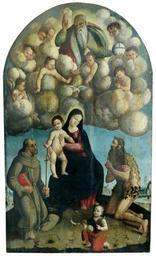 Keywords: Anônimo - Deus Pai, A Virgem, o Menino Jesus, São João Batista, São Francisco e Santo Onofre.jpg author after century 16 technique oil canvas cm 227 141 Institution Museu Nacional de Belas Artes accession number T 2421 object history Coleção Angelo Antonio Rósea credit line PVP LangSwitch Altar painting Formerly attributed to the circle of Perugino It is now thought to be closer to the manner of Marco Cardisco 1486-1542 Este retábulo era documentado anteriormente no museu como obra do círculo de Perugino Acredita-se atualmente que esteja mais próximo da maneira de Marco Cardisco 1486-1542 podendo se tratar de um seguidor deste Acervo de Obras de Arte Europeia em Coleções Brasileiras Plus Ultra http //www plusultra art br/2/detalhe asp idobra 375 info; http //www plusultra art br/2/sistema2/arquivosUpload/02421 jpg image PD-old-100 DEFAULTSORT Anonymous Onuphrius Marco Cardisco xafter Onuphrius Italian paintings in the Museu Nacional de Belas Artes 16th-century paintings in the Museu Nacional de Belas Artes 16th-century paintings of Madonna and Child with the Infant Saint John 16th-century paintings of God the Father 16th-century paintings of Francis of Assisi Altar paintings Paintings of Onuphrius Paintings with semicircular top Renaissance paintings in Brazil Renaissance paintings of saints Religious paintings in the Museu Nacional de Belas Artes Paintings of Christian saints in Brazil