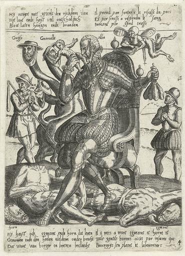 | Keywords: Anónimo - Duque de Alba.jpg es Alba asesina a los inocentes habitantes del país de la colección El gobierno de Alba en los Países Bajos y los resultados de su tiranía - Grabado anónimo de hacia 1572 - El Duque está representado comiendo a un niño con una mano mientras con la otra sostiene bolsas de dinero; detrás una hidra con las cabezas de Granvela y los cardenales de Guise y Lorena; a sus pies los cadáveres decapitados del Conde de Egmont y Felipe de Montmorency Horn ; un demonio alado con un rosario le insufla aire al oído con un fuelle; a la izquierda un campesino y a la derecha un burgués que se lamentan Alba kills innocent inhabitants of the land from the collection Alba's government in the Netherlands and the following tyranny - The Duque is represented eating a child with one hand while he holds a money purse with the other; behind a hydra with the heads of Granvelle and the cardinals of Guise and Lorraine; at his feet the headless bodies of Egmont and Horn; a winged demon with a rosary blows air into the Duque's ear with a bellows; on the left a peasant and on the right a burgois lament https //www rijksmuseum nl/collectie/RP-P-OB-79 012 Alva vermoordt de onschuldige inwoners van het land ca 1572 from the http //www rijksmuseum nl/ lang en Rijsmuseum Anonimous ~ 1572 1570s Fernando Álvarez de Toledo 3rd Duke of Alba Spanish black legend Antoine Perrenot de Granvelle Lamoral Count of Egmont Philip de Montmorency Count of Horne Dutch 16th-century prints in the Rijksmuseum Amsterdam Flemish prints in the Rijksmuseum Amsterdam PD-old |