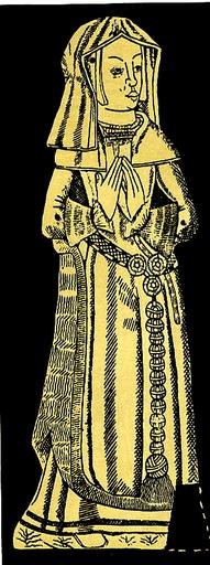 Keywords: Anonymous civilian Lady Norfolk.jpg Rubbing of a memorial brass unknown Tudor lady wearing a gable headdress and veil She wears a fur-lined gown over a kirtle with a girdle or belt There are large paternoster beads attached to her decorative belt by a three-rose buckle This buckle probably symbolizes the three sets of five mysteries in the Rosary devotion from Trivick Henry The Picture Book of Brasses in Gilt New York Charles Scribner's Sons 1971 via http //www uvm edu/~hag/sca/tudor/ Source http //www uvm edu/~hag/sca/tudor/ Date c 1540 PD-old-100 Original upload log en wikipedia Anonymous_civilian_Lady_Norfolk jpg wikitable - 2005-08-07 14 33 322×864× 164476 bytes J heisenberg fairuse Monumental brasses |