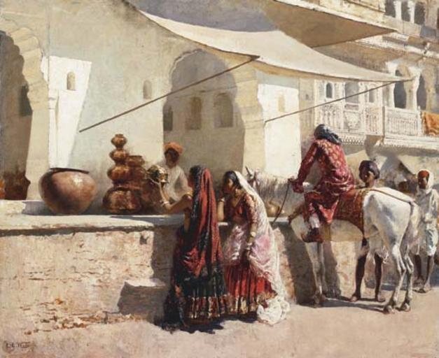 | Keywords: Another Rajasthani street scene by Edwin Lord Weeks.jpg  en Another Rajasthani street scene by Edwin Lord Weeks 1887 probably in Udaipur Source http //www christies com/LotFinder/search/LotDetail asp sid highlights 3Cspan+class 3D 27esn 5Fsegment 27+title 3D 27 2FLotCommon 2FCatalogueEntry 27 3E 0AA+Street+Market+Scene 2C+ 3Cb 3E 3Cspan+class 3D 27esn 5Fhighlight 27 3EIndia 3C 2Fspan 3E 3C 2Fb 3E+ 26lt 3BBR 3C 2Fspan 3E+ 2E 2E 2E intObjectID 4800778 AllObjectIDs 4803582 4803587 4801548 4802265 4793188 4800859 4800778 4799488 4799822 4801547 4801555 4801581 4801553 4801340 4801558 4801556 4801554 4801482 4801559 4801557 RefineQueryURL AdvancedSearch 2Easp 3Fsid 3D 26entry 3Dindia 26T 3DLot 26P 3D 26CF 3D 26SU 3D1 26RQ 3DFalse 26AN 3D1 downloaded Oct 2006 Edwin Lord Weeks American 1849-1903 A Street Market Scene India; signed 'E L Weeks' and stamped with his Mogul device lower left ; oil on canvas 23¾ x 29 in 60 5 x 74 cm Painted circa 1887 Lot Notes A Street Market Scene India is a fine example of Edwin Lord Week's quotidian street scenes of northern India In these paintings Weeks demonstrated his great skills in draftsmanship color and texture in his precise yet suggestive visual records of his Indian travels-the very ordinariness of the scene contrasting sharply with the beautiful forms rich colors and textures of the elements and actors depicted The scene is entirely characteristic of north Indian city streets in which the street is the promenade and a row of shops occupy a built-up platform beneath an arcade of windows and bracketed balconies In the present work the city depicted is probably Udaipur then Oudeypore as suggested by the elaborate windows and shallow balconies depicted at the right side of the painting and by the white plaster covering thebuilding walls In his travel journal from the Black Sea through Persia and India Weeks wrote of Udaipur as 'an endless expanse of white ' The painting was executed circa 1887 in two stages Initially the architectural backdrop of the picture would have been painted in situ; a plein air rendering of the physical context The second stage of the painting would have been executed either while still in India or more likely some time later in the artist's studio in Paris In this second 'campaign' the figures and animals would have been added to the painting based upon a multitude of such elements and poses Weeks had executed in India The present painting is highly finished suggesting it was completed in Week's Paris studio a metalsmith's shop in the shadowed background of white walls and delicately fashioned arched openings The whitewashed setting serves as an an almost neutral background off which the artist plays with great still-life of dancing color and reflections - from a large copper pot to copper and brass jugs and bowls stacked on high The pot in the woman's hands brilliantly reflects the sunlight in its brassy colors and reflections The figures too are brilliantly rendered with variegated silk and cotton embroidered costumes and flowing translucent white muslin The women's arms are covered in silver bracelets their ears in long silver earrings and their necks in goldnecklaces - all of which suggests they may be nautch dancers from the Court The women's bare midriffs unusual in more southern parts of India caught Weeks' attention at the time 'In all the north country costumes there is a wide gap between the bodice and the skirts and the wearer never seems anxious to conceal it' Weeks' letter to the president of the Pennsylvania Academy of Fine Art September 18 1883 The painting relates to and very favorably compares to other Weeks paintings of this genre including A Street Scene in the East National Collection of Fine Arts Smithsonian Institution The Soldier of the Rajah Coming to the Sword Sharpener of Ahmedabad Portland Museum of Art and A Street Scene in North West India probably Udaipur sold at Christie's London 24 September 2003 lot 86 This last work shows a Rajput in blue silk on a similar horse and two young women dressed exactly like the two women in the present painting though rendered in shade instead of the brilliant light of the present work A favorite device in many of these paintings is a Rajput noble atop or standing next to his elaborately-saddled horse turned towards the shop fronts engaged in studying items for sale or often seen in flirtations with young women dressed in a manner similar to the figures in the present painting all with comely faces or profiles We are grateful to D Ellen K Morris for providing the catalogue entry for this work This painting will be included in the catalogue raisonné being prepared by Dr Ellen K Morris 1887 http //www columbia edu/itc/mealac/pritchett/00routesdata/1800_1899/women/balconies/balconies html creator Edwin Lord Weeks PD-old-100 Historical images of Udaipur Paintings of India by Edwin Lord Weeks 19th-century orientalist paintings 19th-century paintings location missing |