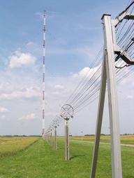 Keywords: Antennenmast Solt.jpg MW-Antennenmast Solt Ungarn A solti adótorony A cage line transmission line to feed radio power to the antenna mast background of the Solt transmitter Hungarian Solti rádióadó for Kossuth Rádió near Solt Hungary which broadcasts on 540 kHz in the medium wave MW band With an output power of 2000 kW 2 MW it is the most powerful medium wave radio transmitter in Europe and also the most powerful in the world along with three Saudi transmitters The line consists of an inner circular bundle of parallel wires carrying the power surrounded by an outer circle of grounded wires that function as a shield The line functions similarly to a large coaxial cable Cage lines are used to carry low frequency high power RF currents de wikipedia Beroesz CommonsHelper <br/> 2005-09-08 11 29 Deneb 1536×2048× 465526 bytes <nowiki> Beschreibung MW-Antennenmast Solt Ungarn Quelle selbst fotografiert Fotograf oder Zeichner Benutzer deneb Datum August 2000 Bild-PD </nowiki> 2005-09-08 Deneb wikipedia de deneb de Solt Tower |