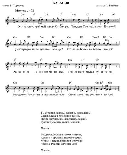| Keywords: Anthems of Khakassia.jpg ru Гимн Республики Хакасия en National Anthem of Republic Khakassia 2016-07-18 www r-19 ru/upload/iblock/854/Постановление 20568 docx В То осов В Шулбаева Г Казачинова Г Танбаев other versions Custom license marker 2016 07 18 PD-RU-exempt Federal subjects anthems of Russia |