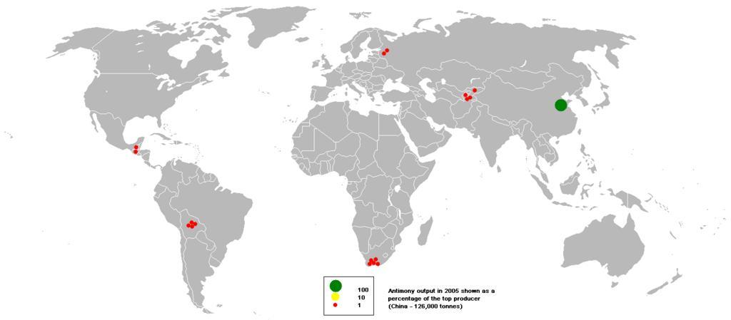 | Keywords: Antimony (mined)2.PNG This bubble map shows the global distribution of antimony output in 2005 as a percentage of the top producer China - 126 000 tonnes This map is consistent with incomplete set of data too as long as the top producer is known It resolves the accessibility issues faced by colour-coded maps that may not be properly rendered in old computer screens Data was extracted on 31st May 2007 Source - http //www bgs ac uk/mineralsuk/commodity/world/home html Based on Image BlankMap-World png http //en wikipedia org/wiki/Image Antimony_ 28mined 292 PNG 14 56 31 May 2007 Anwar saadat en English Wikipedia Anwar saadat Check categories 2008 August 21 Antimony Bubble maps |