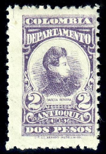 | Keywords: Antioquia 1903-04 Sc153.jpg  José Custodio Cayetano García Rovira the Neogranadine general Catalogue Sc 153 1903 1904 Scan of original Colombian government PD-old-100 PD-Colombia Stamps of Antioquia 1903 stamps purple stamps Presidents of the Provincias Unidas de Nueva Granada |