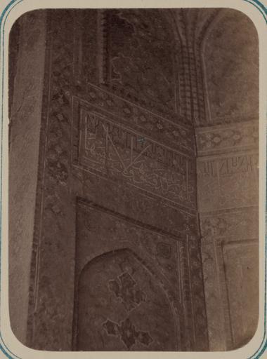 Keywords: Antiquities of Samarkand. Inner Courtyard of the Shir Dar Madrasah (Eastern Side). Inscriptions around the Inner Niche and Its Upper Sections. Beginning WDL3799.png Artwork ru Богаевский иколай Владими ович 1843 1912 гг fr Bogaevskii Nikolaï V 1843-1912 en Bogaevskii Nikolai V 1843-1912 zh 亚历山大·L· ,1840-1888 年 pt Bogaevskii Nikolai V 1843-1912 ar بوغافسكي، نيكولاي ف ، 1843-1912 es Bogaevskii Nikolai V 1843-1912 ru Сама кандские д евности Внут енний дво мед есе Ши -До восточная сто она адписи вок уг внут енней ниши и ее ве хних секций ачало fr Antiquités de Samarcande Cour intérieure de la madrasa de Shir Dar côté est Inscriptions autour de la niche intérieure et ses coupes supérieures Début en Antiquities of Samarkand Inner Courtyard of the Shir Dar Madrasah Eastern Side Inscriptions around the Inner Niche and Its Upper Sections Beginning zh 撒马尔罕古迹 尔·达伊斯兰教学校内部庭院( 侧) 内部壁龛四周的铭文及壁龛的上半部分 始部分 pt Antiguidades de Samarcanda Pátio interno da madrassa Shir Dar lado leste Inscrições em volta do nicho interno e suas seções superiores Início ar آثار سمرقند الفناء الداخلي لمدرسة شيردور الجهة الشرقية نقوش حول المِشْكاة الداخلية وأجزائها العلوية البداية ru Эта фотог афия внут еннего дво а мед есе Ши -До в Сама канде Узбекистан соде жится в а хеологической части <em> Ту кестанского альбома </em> Шеститомное фотог афическое исследование было п оведено в 1871 1872 гг под уководством гене ала Константина П фон Кауфмана пе вого гене ал-губе нато а 1867 1882 гг Ту кестана как называли те ито ию Цент альной Азии п инадлежавшую Российской импе ии В альбоме уделяется особое внимание исламской а хитекту е Сама канда в том числе памятникам XIV и XV вв пе иода п авления Тиму а Таме лана и его п еемников В цент е Сама канда находится ансамбль Регистан объединяющий в себе т и основных об азца <em>madrasah</em> мед есе елигиозных школ Вто ое мед есе в ансамбле Ши -До было пост оено в 1619 1636 гг во в емена династии Ашта ханидов есмот я на значительные пов еждения нанесенные мед есе в течение многих веков оно остается одним из самых богато ук ашенных памятников в Цент альной Азии Фо ма этого мед есе п едставляет собой п ямоугольный дво ок уженный двухэтажной а кадой Здесь видна ве хняя часть ниши <em>iwan</em> сводчатый зал с одним отк ытым концом ок уженный с т ех сто он стенами в цент е восточной стены Пове хности пок ыты многоцветной плиткой майоликой создающей сложные геомет ические и ботанические узо ы П ямоугольные панели со ст ельчатыми а ками ведут к го изонтальной полосе надписи в укописном стиле сулюс ад надписью находятся ост оконечные а очные панели азделенные системой пе есекающихся еб истых сводов <br>А хитекту ные ук ашения и деко ативные элементы; адписи; Исламская а хитекту а; ед есе; Фотог афические исследования fr Cette photographie de l'intérieur de la cour de la madrasa de Shir Dar à Samarcande Ouzbékistan est extraite de l'ouvrage archéologique <em>Album du Turkestan</em> Cet inventaire photographique en six volumes fut réalisé entre 1871 et 1872 sous le patronage du général Konstantin P von Kaufman premier gouverneur général 1867-1882 du Turkestan nom donné aux territoires d'Asie centrale de l'Empire russe L'album porte une attention particulière à l'architecture islamique de Samarcande avec notamment des monuments datant des XIV<sup>e</sup> et XV<sup>e</sup> siècles lors du règne de Tamerlan et de ses successeurs Situé au centre de Samarcande l'ensemble du Registan est composé de trois exemples majeurs de <em>madrasa</em> école religieuse La seconde madrasa de l'ensemble celle de Shir Dar fut construite entre 1619 et 1636 au cours de la dynastie astrakane Malgré les dommages considérables subis au cours des siècles elle demeure l'un des monuments les plus luxueusement décorés d'Asie centrale Cette madrasa est formée d'une cour rectangulaire entourée d'une arcade à deux étages La partie supérieure de la niche de l'<em>aivan </em> salle voûtée dotée de trois murs et d'un côté ouvert est visible ici au centre du mur est Les surfaces sont recouvertes de carreaux de majolique polychromes formant des motifs géométriques et à fleurs complexes Les panneaux rectangulaires dotés d'arches pointues oriente le regard vers une bande d'inscription horizontale en style cursif thulutte Au-dessus de l'inscription des panneaux sont divisés selon un système de voûtes striées entrelacées <br>Décorations et ornemen