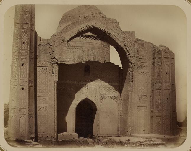 | Keywords: Antiquities of Samarkand. Madrasah of Bibi Khanym. Congregational Mosque (Friday Mosque). View of the Main Facade WDL3762.png Artwork ru Богаевский иколай Владими ович 1843 1912 гг fr Bogaevskii Nikolaï V 1843-1912 en Bogaevskii Nikolai V 1843-1912 zh 亚历山大·L· ,1840-1888 年 pt Bogaevskii Nikolai V 1843-1912 ar بوغافسكي، نيكولاي ف ، 1843-1912 es Bogaevskii Nikolai V 1843-1912 ru Сама кандские д евности ед есе Биби Ханым Собо ная мечеть мечеть джами Вид главного фасада fr Antiquités de Samarcande Madrasa de Bibi Khanym Mosquée de congrégation Mosquée du Vendredi Vue de la façade principale en Antiquities of Samarkand Madrasah of Bibi Khanym Congregational Mosque Friday Mosque View of the Main Facade zh 撒马尔罕古迹 比比·哈内姆伊斯兰教学校 大清 寺(星 五清 寺) 主立 景观 pt Antiguidades de Samarcanda Madrassa de Bibi Khanym Mesquita congregacional mesquita de sexta-feira Imagem da fachada principal ar آثار سمرقند مدرسة بيبي خانوم المسجد الجامع مسجِد الجُمعة منظر للواجهة الرئيسة ru Эта фотог афия главной мечети ансамбля Биби Ханым в Сама канде Узбекистан соде жится в а хеологической части <em> Ту кестанского альбома </em> Шеститомное фотог афическое исследование было подготовлено и издано в 1871 1872 гг под пат онажем гене ала Константина П фон Кауфмана пе вого гене ал-губе нато а 1867 1882 гг Ту кестана как называли в то в емя те ито ию Цент альной Азии п инадлежавшую Российской импе ии В альбоме уделяется особое внимание исламской а хитекту е Сама канда в том числе памятникам XIV и XV вв пе иода п авления Тиму а Таме лана и его п еемников Пост оенный в 1399 1405 гг за счет т офеев добытых в индийской кампании Тиму а ансамбль Биби Ханым был местом асположения главной мечети го ода названной в честь ста шей жены Тиму а Са ай ульк Ханым <em>bibi</em> означает леди или мать Главная или пятничная мечеть находящаяся в цент е ансамбля является одной из к упнейших в исламском ми е Вследствие асположения в активной сейсмической зоне главной мечети как и всем ст оениям в ансамбле был нанесен се ьезный уще б а фотог афии главного фасада видна а ка монументального входного <em>айвана</em> а также остатки ок ужающих мина етов За айваном видна а ка по тала или <em>пештак</em> над кото ой возвышается ба абан подде живающий ог омный купол есмот я на пов еждения уцелели многие из пе воначальных ук ашений в том числе геомет ические исунки из глазу ованной плитки цветочные узо ы из мозаики а также деко ативные надписи в куфическом стиле <br>А хеологические объекты; Исламская а хитекту а; ед есе; ечети; Фотог афические исследования fr Cette photographie de la mosquée principale de l'ensemble de Bibi Khanym à Samarcande Ouzbékistan est extraite de l'ouvrage archéologique <em>Album du Turkestan</em> Cet inventaire photographique en six volumes fut réalisé entre 1871 et 1872 sous le patronage du général Konstantin P von Kaufman premier gouverneur général 1867-1882 du Turkestan nom donné aux territoires d'Asie centrale de l'Empire russe L'album consacre une attention particulière à l'architecture islamique de Samarcande avec notamment des monuments datant des XIV<sup>e</sup> et XV<sup>e</sup> siècles lors du règne de Tamerlan et de ses successeurs Construit entre 1399 et 1405 avec le butin de la campagne de Tamerlan en Inde l'ensemble de Bibi Khanym était l'emplacement de la mosquée principale de la ville et fut nommé en hommage à la première épouse de Tamerlan Sarai Mulk Khanym <em>bibi</em> signifiant « dame » ou « mère » La vaste structure de la mosquée principale ou Mosquée du Vendredi une des plus grandes du monde islamique se trouve au centre de l'ensemble l'instar de toutes les structures de l'ensemble la mosquée principale a subi des dommages considérables dus à l'activité sismique de cette région Cette vue de la façade principale présente l'arceau de l'<em>aivan</em> d'entrée monumental et les vestiges des minarets l'encadrant L'arceau du portail ou <em>peshtak</em> au-dessus duquel s'élève le tambour soutenant le grand dôme est visible au-delà de l'aivan Malgré des pertes considérables la majeure partie de la décoration d'origine existe encore notamment des figures géométriques sur des carreaux vernissés des motifs de mosaïque à fleurs et des inscriptions ornementales en style coufique <br>Sites archéologiques; Architecture islamique; Madrasas; Mosquées; Inventaires photographiques en This photograph of the main mosque at the Bibi Khanym ensemble in Samarkand Uzbekistan is from the archeological part of <em>Turkestan Album</e