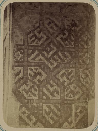Keywords: Antiquities of Samarkand. Madrasah of Nadir Divan-Begi. Inscriptions Around the Inner Main Niche in Front of the Door from Outside WDL3776.png Artwork ru Богаевский иколай Владими ович 1843 1912 гг fr Bogaevskii Nikolaï V 1843-1912 en Bogaevskii Nikolai V 1843-1912 zh 亚历山大·L· ,1840-1888 年 pt Bogaevskii Nikolai V 1843-1912 ar بوغافسكي، نيكولاي ف ، 1843-1912 es Bogaevskii Nikolai V 1843-1912 ru Сама кандские д евности ед есе ади Диван-Беги адписи идущие внут и главной ниши п и входе с улицы fr Antiquités de Samarcande Madrasa de Nadir Divan-Begi Inscriptions autour de la principale niche intérieure face à la porte depuis l'extérieur en Antiquities of Samarkand Madrasah of Nadir Divan-Begi Inscriptions Around the Inner Main Niche in Front of the Door from Outside zh 撒马尔罕古迹 纳迪尔·迪万- 吉伊斯兰教学校 外侧大门前 内部主壁龛四周的铭文 pt Antiguidades de Samarcanda Madrassa de Nadir Divan-Begi Inscrições em torno do nicho principal interno em frente à porta vista desde fora ar آثار سمرقند مدرسة نذير ديفان بيغي نقوش حول المِشْكاة الداخلية الرئيسية أمام الباب من الخارج ru Эта фотог афия мед есе ади Диван-Беги в Сама канде Узбекистан соде жится в а хеологической части <em> Ту кестанского альбома </em> Шеститомное фотог афическое исследование было подготовлено и издано в 1871 1872 гг под пат онажем гене ала Константина П фон Кауфмана пе вого гене ал-губе нато а 1867 1882 гг Ту кестана как называли в то в емя те ито ию Цент альной Азии п инадлежавшую Российской импе ии В альбоме уделяется особое внимание исламскому а хитекту ному наследию Сама канда Эта <em>мед есе</em> елигиозная школа асположенная ядом с усыпальницей Ходжа Ах а была пост оена в 1631 г ади ом Диван-Беги визи ем и дядей буха ского п авителя Имам-Кули Хана ед есе в плане выглядела как п ямоугольный дво с п илегающей одноэтажной к ытой гале еей для ученых и мечетью с одной сто оны а фотог афии видна ве хняя п авая часть ниши об азованной главной а кой <em>айвана</em> сводчатого зала с одним отк ытым концом ок уженного с т ех сто он стенами выходящей на улицу Пове хность стены пок ыта ке амической плиткой искусные геомет ические узо ы из кото ой соде жат куфические буквы об азующие слова из калимы основы шахады или исламской декла ации ве ы Основными цветами плитки являются синий и голубой с элементами белого желтого и о анжевого цветов а задней стене ниши с т удом азличимой сп ава п одолжается о намент отделки к ыла С левого к ая находится внешняя пове хность фасада айвана ук ашенная фаянсовыми панелями <br>А хитекту ные ук ашения и деко ативные элементы; адписи; Исламская а хитекту а; ед есе; Фотог афические исследования fr Cette photographie de la mosquée de Madrasa de Nadir Divan-Begi à Samarcande Ouzbékistan est extraite de l'ouvrage archéologique <em>Album du Turkestan</em> Cet inventaire photographique en six volumes fut réalisé entre 1871 et 1872 sous le patronage du général Konstantin P von Kaufman premier gouverneur général 1867-1882 du Turkestan nom donné aux territoires d'Asie centrale de l'Empire russe L'album consacre une attention particulière à l'héritage de l'architecture islamique de Samarcande Jouxtant le sanctuaire de Khodzha Akhrar cette <em>madrasa</em> école religieuse fut achevée en 1631 sous Nadir Divan-Begi vizir et oncle du souverain de Boukhara Imam-Quli Khan Elle fut conçue comme une cour rectangulaire entourée d'un cloître à un étage pour les érudits avec une mosquée à une extrémité Cette vue présente la partie centrale du flanc gauche de la niche formée par l'arceau principal de l'<em>aivan </em> salle voûtée dotée de trois murs et d'un côté ouvert face à la rue La surface du mur est composée de carreaux de céramique dont les motifs géométriques sophistiqués incluent des lettres kufiques angulaires formant des mots de la kalima fondement de la chahada et profession de foi islamique Les couleurs de base des carreaux sont le bleu foncé et le bleu clair avec des détails en blanc jaune et orange Le mur du fond de la niche est à peine visible sur la droite mais il arbore les mêmes motifs ornementaux que le flanc Complètement à gauche la surface extérieure de la façade de l'aivan est décorée de panneaux de lambris recouverts de faïence <br>Décorations et ornements architecturaux; Inscriptions; Architecture islamique; Madrasas; Inventaires photographiques en This photograph of the Nadir Divan-Begi Madrasah in Samarkand Uzbekistan is from the archeological part of <em>Turkestan Album</em> The six-vol