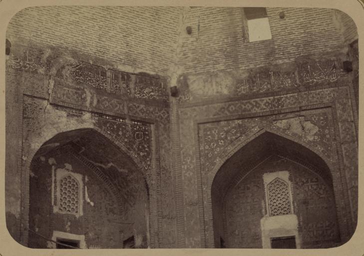 Keywords: Antiquities of Samarkand. Madrasah of Tillia Kari. Main Facade (Southern). Middle. Inscription along the Inside of the Main Niche and Its Upper Part WDL3844.png Artwork ru Богаевский иколай Владими ович 1843 1912 гг fr Bogaevskii Nikolaï V 1843-1912 en Bogaevskii Nikolai V 1843-1912 zh 亚历山大·L· ,1840-1888 年 pt Bogaevskii Nikolai V 1843-1912 ar بوغافسكي، نيكولاي ف ، 1843-1912 es Bogaevskii Nikolai V 1843-1912 ru Сама кандские д евности ед есе Тилля-Ка и Главный фасад южный Се едина адпись внут и главной ниши в ве хней ее части fr Antiquités de Samarcande Madrasa de Tillia Kari Façade principale sud Centre Inscription le long du mur intérieur de la niche principale et de sa partie supérieure en Antiquities of Samarkand Madrasah of Tillia Kari Main Facade Southern Middle Inscription along the Inside of the Main Niche and Its Upper Part zh 撒马尔罕古迹 季里雅·卡利伊斯兰教学校 主立 (南侧) 中间部分 主壁龛内侧及其上部的铭文 pt Antiguidades de Samarcanda Madrassa de Tillia Kari Fachada principal sul Meio Inscrição na parte interna no nicho principal e em sua parte superior ar آثار سمرقند مدرسة تِلْيَا كَرِى الواجهة الرئيسية الجنوبية الوسط نقش بطول الجزء الداخلي والعلوي من المِشْكاة الرئيسية ru Эта фотог афия главного входа в мед есе Тилля-Ка и в Сама канде Узбекистан соде жится в а хеологической части <em> Ту кестанского альбома </em> Шеститомное фотог афическое исследование было подготовлено и издано в 1871 1872 гг под пат онажем гене ала Константина П фон Кауфмана пе вого гене ал-губе нато а 1867 1882 гг Ту кестана как называли в то в емя те ито ию Цент альной Азии п инадлежавшую Российской импе ии В альбоме уделяется особое внимание исламской а хитекту е Сама канда в том числе памятникам XIV и XV вв пе иода п авления Тиму а Таме лана и его п еемников В цент е Сама канда находится ансамбль Регистан объединяющий в себе т и основных об азца <em>madrasah</em> мед есе елигиозных школ Т етья часть Регистана мед есе Тилля-Ка и была пост оена в 1646 1660 гг на месте бывшего ка аван-са ая Вход в п ямоугольный дво ок ужен ог омным <em>айваном</em> сводчатым залом с одним отк ытым концом ок уженным с т ех сто он стенами и двухэтажной сводчатой гале еей с комнатами для ученых а этом снимке показана ве хняя часть ниши айвана в том числе часть сводчатой гале еи внут и многоугольной ниши Ст ельчатые а ки об амляют две и и окна с узо чатой ешеткой Эта сложная пове хность пок ыта многоцветной плиткой майоликой об азующей сложные геомет ические и ботанические узо ы Све ху гале ея заканчивается го изонтальной полосой с надписью в укописном стиле есмот я на довольно хо ошо сох анившуюся ке амику ве хние своды лишены ук ашений <br>А хитекту ные ук ашения и деко ативные элементы; адписи; Исламская а хитекту а; ед есе; иши; Фотог афические исследования fr Cette photographie de l'entrée principale de la madrasa de Tillia Kari à Samarcande Ouzbékistan est extraite de l'ouvrage archéologique <em>Album du Turkestan</em> Cet inventaire photographique en six volumes fut réalisé entre 1871 et 1872 sous le patronage du général Konstantin P von Kaufman premier gouverneur général 1867-1882 du Turkestan nom donné aux territoires d'Asie centrale de l'Empire russe L'album consacre une attention particulière à l'architecture islamique de Samarcande avec notamment des monuments datant des XIV<sup>e</sup> et XV<sup>e</sup> siècles lors du règne de Tamerlan et de ses successeurs Situé au centre de Samarcande l'ensemble du Registan est composé de trois exemples majeurs de <em>madrasa</em> école religieuse Le troisième composant du Registan la madrasa de Tillia Kari fut construit entre 1646 et 1660 sur le site d'un ancien caravansérail L'entrée de la cour rectangulaire est abritée par un grand <em>aivan</em> salle voûtée dotée de trois murs et d'un côté ouvert encadré d'une arcade à deux étages contenant des salles réservées aux érudits Cette vue présente la partie supérieure de la niche de l'aivan dont un segment de l'arcade dans la niche polygonale Les arceaux pointus encadrent les portes et les fenêtres en croisillons Cette surface complexe est recouverte de carreaux de majolique polychromes formant des motifs géométriques et à fleurs sophistiqués L'arcade est dominée par une bande d'inscription horizontale en style cursif Malgré le fait que les céramiques soient relativement bien conservées les voûtes dans la partie supérieure sont dépourvues de décoration <br>Décorations et ornements architect