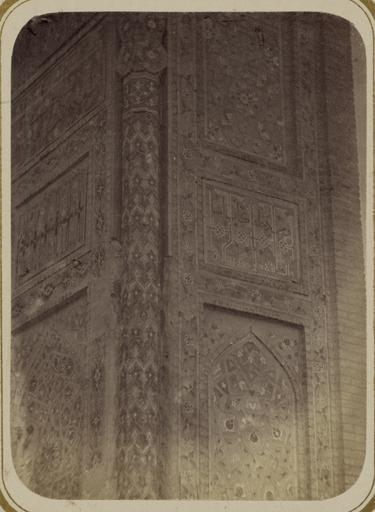 | Keywords: Antiquities of Samarkand. Mausoleum of the Emir Timur Kuragan (Gur-Emir). Inscription along the Sides and inside the Main Entry Niche WDL3723.png Artwork ru Богаевский иколай Владими ович 1843 1912 гг fr Bogaevskii Nikolaï V 1843-1912 en Bogaevskii Nikolai V 1843-1912 zh 亚历山大·L· ,1840-1888 年 pt Bogaevskii Nikolai V 1843-1912 ar بوغافسكي، نيكولاي ف ، 1843-1912 es Bogaevskii Nikolai V 1843-1912 ru Сама кандские д евности авзолей эми а Тиму а Ку агана Гу -Эми адписи по сто онам и внут и главной входной ниши fr Antiquités de Samarcande Mausolée de l'émir Timour Kuragan Gour Emir Inscription le long des côtés et à l'intérieur de la niche de l'entrée principale en Antiquities of Samarkand Mausoleum of the Emir Timur Kuragan Gur-Emir Inscription along the Sides and inside the Main Entry Niche zh 撒马尔罕古迹 埃米尔帖 儿·库拉甘的陵墓(古尔-埃米尔) 主入口壁龛外侧与内侧的铭文 pt Antiguidades de Samarcanda Mausoléu de Tamerlão Gur-Emir Inscrição nas laterais e dentro do nicho da entrada principal ar آثار سمرقند ضريح الأمير تيمور كوراغان گورِ أمير نقش بطول الجانبين وداخل مِشْكاة المدخل الرئيسي ru Эта замечательная фотог афия детали входной а ки во дво мавзолея Гу -Эми в Сама канде Узбекистан соде жится в а хеологической части <em> Ту кестанского альбома </em> Шеститомное фотог афическое исследование было подготовлено и издано в 1871 1872 гг под пат онажем гене ала Константина П фон Кауфмана пе вого гене ал-губе нато а 1867 1882 гг Ту кестана как называли в то в емя те ито ию Цент альной Азии п инадлежавшую Российской импе ии В альбоме уделяется особое внимание исламскому а хитекту ному наследию Сама канда включая Гу -Эми на пе сидском языке означает г обница повелителя Гу -Эми известен в пе вую оче едь как место захо онения Тиму а Таме лана хотя Тиму начал его ст оительство еще в 1403 г в память своего любимого внука ухаммада Султана уме шего в воз асте 27 лет После похо он Тиму а в 1405 г Гу -Эми стал мавзолеем Тиму идов а фотог афии виден п авый угол а ки входной ниши <em>айвана</em> сводчатый зал с одним отк ытым концом ок уженный с т ех сто он стенами Угол выделен п ислоненной ке амической колонной и капителью с многоцветными деко ативными панелями с каждой сто оны Слева от колонны находится п авое к ыло ниши айвана В ст ельчатой а ке на нижней панели видны ботанические фигу ы из многоцветного фаянса об азующие геомет ические узо ы а ве хней панели изоб ажен п ямолинейный геомет ический узо с цветочными элементами Похожая последовательность узо а видна сп ава на главном фасаде Панели об амлены бо дю ами с цветочными мотивами <br>А хитекту ные ук ашения и деко ативные элементы; адписи; Исламская а хитекту а; Фотог афические исследования; огильные памятники; Тиму 1336-1405 гг ; Г обницы fr Cette photographie remarquable des détails de l'arceau d'entrée menant vers la cour du mausolée de Gour Emir à Samarcande Ouzbékistan est extraite de l'ouvrage archéologique <em>Album du Turkestan</em> Cet inventaire photographique en six volumes fut réalisé entre 1871 et 1872 sous le patronage du général Konstantin P von Kaufman premier gouverneur général 1867-1882 du Turkestan nom donné aux territoires d'Asie centrale de l'Empire russe L'album consacre une attention particulière à l'héritage de l'architecture islamique de Samarcande notamment Gour Emir « tombe du souverain » en persan Bien qu'il soit principalement connu comme le lieu de sépulture de Tamerlan Gour Emir fut commencé sous Tamerlan en 1403 pour commémorer la mort de son petit-fils bien-aimé le sultan Mahomet à l'âge de 27 ans Lorsque Tamerlan y fut enterré en 1405 Gour Emir devint le mausolée des Timourides Cette vue présente l'angle droit de l'arceau de l'<em>aivan </em> salle voûtée dotée de trois murs et d'un côté ouvert de la structure d'entrée L'angle est marqué par une colonne de céramique fixée et un chapiteau doté de panneaux de lambris décoratifs polychromes des deux côtés Le flanc droit de la niche de l'aivan est visible à gauche de la colonne Dans le panneau inférieur l'arceau pointu est orné de figures à fleurs de faïence polychrome disposées dans des motifs géométriques Au-dessus le panneau contient un motif géométrique rectiligne avec des éléments floraux droite la façade principale présente une progression similaire Les panneaux de lambris sont bordés de motifs à fleurs <br>Décorations et ornements architecturaux; Inscriptions; Architecture islamique; 