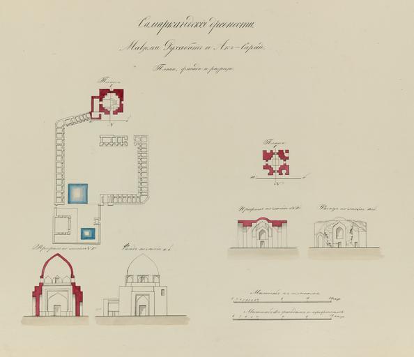 Keywords: Antiquities of Samarkand. Mausoleums of Rukhabad and Ak Sarai. Plans, Facades, and Sections WDL3579.png Artwork ru Богаевский иколай Владими ович 1843 1912 гг fr Bogaevskii Nikolaï V 1843-1912 en Bogaevskii Nikolai V 1843-1912 zh 亚历山大·L· ,1840-1888 年 pt Bogaevskii Nikolai V 1843-1912 ar بوغافسكي، نيكولاي ف ، 1843-1912 es Bogaevskii Nikolai V 1843-1912 ru Сама кандские д евности авзолеи Рухабад и Ак Са ай Планы фасады и аз езы fr Antiquités de Samarcande Mausolées de Rukhabad et d'Ak Sarai Plans façades et sections en Antiquities of Samarkand Mausoleums of Rukhabad and Ak Sarai Plans Facades and Sections zh 撒马尔罕古迹 鲁克哈巴达和阿克萨莱的陵墓 平 图 外立 和截 图 pt Antiguidades de Samarcanda Mausoléus de Rukhabad e Ak Sarai Planos fachadas e seções ar آثار سمرقند أضرحة روح آباد وآك ساراي التصميمات والواجهات والمقاطع ru Эти планы фасады и аз езы двух мавзолеев в Сама канде Узбекистан соде жатся в а хеологической части <em> Ту кестанского альбома </em> Шеститомное фотог афическое исследование было п оведено в 1871 1872 гг под уководством гене ала Константина П фон Кауфмана пе вого гене ал-губе нато а 1867 1882 гг Ту кестана как называли те ито ию Цент альной Азии п инадлежавшую Российской импе ии В альбоме уделяется особое внимание исламскому а хитекту ному наследию Сама канда Слева на исунке изоб ажен план мавзолея известного как Рухабад жилище души цент ализованного куполооб азного ст оения асположенного ядом с мавзолеем Тиму идов Гу -Эми ом и пост оенного ве оятно в 1380 г для муд еца и мистика шейха Бу ханеддина Сага джи кото ого почитал Тиму Таме лан Главный вход в Рухабад ведет в большой дво ок уженный к ытой гале еей а плане также изоб ажены два квад атных бассейна В нижней части плана находятся фасад и аз ез на кото ых пе воначальная каменная кладка стен отмечена к асным цветом Сп ава асполагается более ск омный мавзолей Ак Са ай пост оенный в 1470 г по п иказу п авителя династии Тиму идов Абу Саида в качестве дополнения к Гу -Эми у как место захо онения для мужской линии династии Абу Саид уме около 1469 г в битве с ту кменскими войсками в Азе байджане Также являющийся цент ализованным ст оением частично пов ежденный Ак Са ай не обладает внушительным куполом Рухабада Тем не менее его связь с династией Тиму идов п идает ему большое значение <br>А хитекту ные че тежи; Исламская а хитекту а; П оекции; огильные памятники; Тиму 1336-1405 гг ; Г обницы fr Ces plans élévations et sections de deux mausolées de Samarcande Ouzbékistan sont extraits de l'ouvrage archéologique <em>Album du Turkestan</em> Cet inventaire photographique en six volumes fut réalisé entre 1871 et 1872 sous le patronage du général Konstantin P von Kaufman premier gouverneur général 1867-1882 du Turkestan nom donné aux territoires d'Asie centrale de l'Empire russe L'album consacre une attention particulière à l'héritage de l'architecture islamique de Samarcande Sur la gauche on peut voir le plan du site du mausolée appelé Rukhabad « demeure de l'âme » structure dotée d'un dôme central et située près du mausolée des Timourides de Gour Emir Elle fut probablement construite dans les années 1380 pour le sage et mystique Cheikh Burkhaneddin Sagardzhi vénéré par Tamerlan L'entrée principale de Rukhabad faisait face à une grande cour entourée par un cloître Le plan illustre également deux bassins carrés Une élévation et une section sont dessinées au-dessous du plan et les murs de maçonnerie principaux sont représentés en rouge Le mausolée d'Ak Sarai apparaît sur la droite De conception plus modeste il fut construit dans les années 1470 au commandement du souverain timouride Abu Saïd pour venir compléter Gour Emir comme lieu de sépulture de la lignée masculine de la dynastie Abu Saïd est mort en 1469 environ lors d'une bataille contre les forces turkmènes en Azerbaïdjan Structure également centralisée le mausolée d'Ak Sarai en partie endommagé ne dispose pas du dôme imposant de Rukhabad Toutefois son association à la dynastie Timouride lui donne une grande importance <br>Dessins architecturaux; Architecture islamique; Projections; Monuments funéraires; Tamerlan 1336-1405; Tombes en These plans elevations and sections of two mausoleums in Samarkand Uzbekistan are from the archeological part of <em>Turkestan Album</em> The six-volume photographic survey was produced in 1871-72 under the patronage of General Konstantin P von Kaufman the first governor-general 1867-82 of Turkestan as the Russian Empire s Central Asian territories were called The album dev