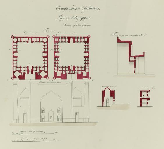 Keywords: Antiquities of Samarkand. Shir Dar Madrasah. Plan, Elevation, and Sections WDL3933.png Artwork ru Шостак Л А fr Shostak L A en Shostak L A zh L A ·斯塔克 pt Shostak L A ar شوستاك، ل أ es Shostak L A ru Сама кандские д евности ед есе Ши -До План фасад и аз езы fr Antiquités de Samarcande Madrasa de Shir Dar Plan élévation et sections en Antiquities of Samarkand Shir Dar Madrasah Plan Elevation and Sections zh 撒马尔罕古迹 尔·达伊斯兰教学校 平 图 立 图和截 图 pt Antiguidades de Samarcanda Madrassa Shir Dar Plano elevação e seções ar آثار سمرقند مدرسة شير دار التصميم والمسقط الأمامي والمقاطع ru Этот план фасад и аз ез мед есе Ши -До в Сама канде Узбекистан соде жится в а хеологической части <em> Ту кестанского альбома </em> Шеститомное фотог афическое исследование было подготовлено и издано в 1871 1872 гг под пат онажем гене ала Константина П фон Кауфмана пе вого гене ал-губе нато а 1867 1882 гг Ту кестана как называли в то в емя те ито ию Цент альной Азии п инадлежавшую Российской импе ии В альбоме уделяется особое внимание исламской а хитекту е Сама канда в том числе памятникам XIV и XV вв пе иода п авления Тиму а Таме лана и его п еемников В цент е Сама канда находится ансамбль Регистан объединяющий в себе т и основных об азца <em>мед есе</em> елигиозных школ Самое ста ое мед есе площади Регистан было пост оено в 1417 1420 гг ученым-п авителем Улугбеком внуком Тиму а Вто ое мед есе Ши -До было пост оено в 1619 1636 гг во в емена буха ской династии Ашта ханидов Фо ма этого мед есе типична для Цент альной Азии внушительная а ка <em>айван</em> или сводчатый зал с одним отк ытым концом ок уженный с т ех сто он стенами ведет в п ямоугольный дво ок уженный двухэтажной сводчатой гале еей с комнатами для около 100 учеников По углам п ямоугольника асполагались четы е мина ета и четы е еб истых купола возвышавшихся над учебными залами ап отив по тала находилась мечеть с куполом В каждой из четы ех стен асполагался а очный по тал пок ытый ке амическими ук ашениями есмот я на то что мед есе Ши -До и его мина етам были нанесены пов еждения вследствие асположения в активной сейсмической зоне ст оение относительно хо ошо сох анилось <br>А хитекту ные че тежи; Исламская а хитекту а; ед есе fr Ces plan section et élévation de la madrasa de Shir Dar à Samarcande Ouzbékistan sont extraits de l'ouvrage archéologique <em>Album du Turkestan</em> Cet inventaire photographique en six volumes fut réalisé entre 1871 et 1872 sous le patronage du général Konstantin P von Kaufman premier gouverneur général 1867-1882 du Turkestan nom donné aux territoires d'Asie centrale de l'Empire russe L'album consacre une attention particulière à l'architecture islamique de Samarcande avec notamment des monuments datant des XIV<sup>e</sup> et XV<sup>e</sup> siècles lors du règne de Tamerlan et de ses successeurs Situé au centre de Samarcande l'ensemble du Registan est composé de trois exemples majeurs de <em>madrasa</em> école religieuse La première madrasa du Registan fut bâtie entre 1417 et 1420 par le roi-érudit Ulugh Beg petit-fils de Tamerlan La madrasa de Shir Dar le second exemple fut construite entre 1619 et 1636 au cours de la dynastie astrakane de Boukhara Typique de la région cette madrasa est formée d'une entrée imposante <em>aivan</em> ou salle voûtée dotée de trois murs et d'un côté ouvert qui mène vers une cour rectangulaire entourée d'une arcade à deux étages contenant les salles dédiées aux quelques 100 étudiants Le rectangle était relié aux angles par quatre minarets et quatre dômes striés au-dessus des salles d'enseignement Une mosquée surmontée d'un dôme occupe la façade opposée à l'entrée Chacun des quatre côtés est doté d'une entrée voûtée recouverte d'ornements de céramique Malgré les dommages dus à l'activité sismique de cette région la structure de Shir Dar et de ses minarets reste relativement bien conservée <br>Dessins architecturaux; Architecture islamique; Madrasas en This plan section and elevation of the Shir Dar Madrasah in Samarkand Uzbekistan is from the archeological part of <em>Turkestan Album</em> The six-volume photographic survey was produced in 1871-72 under the patronage of General Konstantin P von Kaufman the first governor-general 1867-82 of Turkestan as the Russian Empire s Central Asian territories were called The album devotes special attention to Samarkand s Islamic architecture such as 14th- and 15th-century monuments from the reign of Timur Tamerlane and his successors In the center of Samarkand is the Registan ensemble composed of three major examples of a 