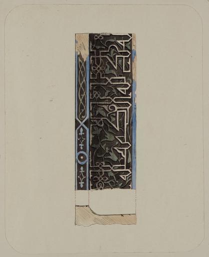 Keywords: Antiquities of Samarkand. Tomb of the Saint Kusam-ibn-Abbas (Shah-i Zindah) and Adjacent Mausoleums. Mausoleum of Khodzha Akhmed. Sections of Inscriptions on the Front Facade WDL3904.png Artwork ru Шостак Л  А fr Shostak L A en Shostak L A zh L A ·斯塔克 pt Shostak L A ar شوستاك، ل أ es Shostak L A ru Сама кандские д евности Г обница святого Куссама ибн Абасса Шах-Зиндэ и мавзолеи п и ней авзолей Ходжи Ахмеда Части надписей на главном фасаде fr Antiquités de Samarcande Sépulcre de Kusam-ibn-Abbas Shah-i Zindah et mausolées adjacents Mausolée de Khodzha Akhmed Sections des inscriptions sur la façade en Antiquities of Samarkand Tomb of the Saint Kusam-ibn-Abbas Shah-i Zindah and Adjacent Mausoleums Mausoleum of Khodzha Akhmed Sections of Inscriptions on the Front Facade zh 撒马尔罕古迹 库萨姆-伊 -阿巴斯之墓(夏伊辛达)及其邻近陵墓 贾·艾哈迈德陵墓 正立 上的部分铭文 pt Antiguidades de Samarcanda Túmulo do Santo Kusam-ibn-Abbas Shah-i Zindah e mausoléus adjacentes Mausoléu de Khodzha Akhmed Seção das inscrições na fachada frontal ar آثار سمرقند ضَرِيح الوَلِيّ قثم بن عباس شاه زنده والأضرحة المجاورة ضريح خواجه أحمد أجزاء من النقوش الموجودة على الواجهة الأمامية ru Эта аква ель с изоб ажением ф агмента фасада мавзолея Ходжи Ахмеда асположенного на те ито ии нек ополя Шах-Зиндэ в Сама канде соде жится в а хеологической части <em> Ту кестанского альбома </em> Шеститомное фотог афическое исследование было подготовлено и издано в 1871 1872 гг под пат онажем гене ала Константина П фон Кауфмана пе вого гене ал-губе нато а 1867 1882 гг Ту кестана как называли в то в емя те ито ию Цент альной Азии п инадлежавшую Российской импе ии В альбоме уделяется особое внимание исламской а хитекту е Сама канда в том числе памятникам XIV и XV вв пе иода п авления Тиму а Таме лана и его п еемников Шах-Зиндэ в пе еводе с пе сидского живой ца ь почитается как мемо иал Куссама ибн Абасса двою одного б ата п о ока ухаммада П едполагается что мавзолей Ходжа Ахмада был пост оен в 1360-х гг для местного духовного лиде а Этот частично пов ежденный памятник асположенный в конце п охода нек ополиса в севе ной г уппе г обниц ук ашен я ким многоцветным ке амическим о наментом с цветочными геомет ическими и буквенными узо ами А ка фасада или <em>пештак</em> с обеих сто он ок ужена езными глазу ованными колоннами из те акоты и полосами с надписями сложной геомет ической фо мы а данном исунке изоб ажен ф агмент левой сто оны а ки на кото ом стилизованные куфические буквы сочетаются с пе еплетающимся витиеватым мотивом есмот я на свою уп ощенность подобные аква ельные эскизы соде жат инфо мацию о цвете кото ую невозможно было пе едать п и помощи фотог афий того в емени <br>А хитекту ные ук ашения и деко ативные элементы; Исламская а хитекту а; огильные памятники; Шах-Зиндэ; Г обницы; Аква ельные исунки fr Cette aquarelle d'un détail de façade du mausolée de Khodzha Akhmed de la nécropole de Shah-i Zindah à Samarcande est extraite de l'ouvrage archéologique <em>Album du Turkestan</em> Cet inventaire photographique en six volumes fut réalisé entre 1871 et 1872 sous le patronage du général Konstantin P von Kaufman premier gouverneur général 1867-1882 du Turkestan nom donné aux territoires d'Asie centrale de l'Empire russe L'album consacre une attention particulière à l'architecture islamique de Samarcande avec notamment des monuments datant des XIV<sup>e</sup> et XV<sup>e</sup> siècles lors du règne de Tamerlan et de ses successeurs L'ensemble de Shah-i Zindah « roi vivant » en persan est un mémorial dédié à la vénération de Kusam-ibn-Abbas cousin du prophète Mahomet Le mausolée de Khodzha Akhmed fut construit dans les années 1360 vraisemblablement pour un chef spirituel Situé au bout du passage de la nécropole au nord de l'ensemble des sanctuaires ce monument en partie endommagé présente encore des ornements en céramique polychromes exceptionnels composés de motifs à fleurs géométriques et épigraphiques L arceau de façade ou <em>peshtak</em> est flanqué de colonnes en terre cuite vernissée et de bandes d inscriptions sculptées décorées de motifs géométriques complexes Cette esquisse du côté gauche de l arceau montre un fragment composé de lettres coufiques à motifs avec des vrilles entrelacées Bien que simplifiées ces esquisses à l'aquarelle fournissent des informations relatives aux couleurs qui ne sont pas disponibl