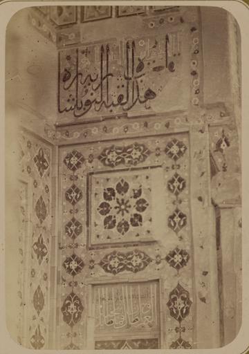 | Keywords: Antiquities of Samarkand. Tomb of the Saint Kusam-ibn-Abbas (Shah-i Zindah) and Adjacent Mausoleums. Mausoleum of the Aine Khane (Emir Mussa). Inscriptions on the Upper Left Panel of the Niche WDL3627.png Artwork ru Богаевский иколай Владими ович 1843 1912 гг fr Bogaevskii Nikolaï V 1843-1912 en Bogaevskii Nikolai V 1843-1912 zh 亚历山大·L· ,1840-1888 年 pt Bogaevskii Nikolai V 1843-1912 ar بوغافسكي، نيكولاي ف ، 1843-1912 es Bogaevskii Nikolai V 1843-1912 ru Сама кандские д евности Г обница святого Куссама ибн Абасса Шах-Зиндэ и мавзолеи п и ней авзолей Айнэ-Ханэ эми а уссы адписи на ве хней левой панели ниши fr Antiquités de Samarcande Sépulcre de Kusam-ibn-Abbas Shah-i Zindah et mausolées adjacents Mausolée d'Aine Khane émir Mussa Inscriptions sur le panneau supérieur gauche de la niche en Antiquities of Samarkand Tomb of the Saint Kusam-ibn-Abbas Shah-i Zindah and Adjacent Mausoleums Mausoleum of the Aine Khane Emir Mussa Inscriptions on the Upper Left Panel of the Niche zh 撒马尔罕古迹 库萨姆-伊 -阿巴斯之墓(夏伊辛达)及其邻近陵墓 艾内·克哈内(埃米尔·穆萨)陵墓 壁龛左上方嵌 上的铭文 pt Antiguidades de Samarcanda Túmulo do Santo Kusam-ibn-Abbas Shakhi Zinda e mausoléus adjacentes Mausoléu de Aine Khane Emir Mussa Inscrição no painel esquerdo superior do nicho de entrada ar آثار سمرقند ضَرِيح الوَلِيّ قثم بن عباس شاه زنده والأضرحة المجاورة ضريح عين خان الأمير موسى نقوش على اللوحة اليسرى العليا للمِشْكاة ru Эта фотог афия деко ативной ке амики на мавзолее Туман-Ака в нек ополе Шах-Зиндэ в Сама канде соде жится в а хеологической части <em> Ту кестанского альбома </em> Шеститомное фотог афическое исследование было подготовлено и издано в 1871 1872 гг под пат онажем гене ала Константина П фон Кауфмана пе вого гене ал-губе нато а 1867 1882 гг Ту кестана как называли в то в емя те ито ию Цент альной Азии п инадлежавшую Российской импе ии В альбоме уделяется особое внимание исламской а хитекту е Сама канда в том числе памятникам XIV и XV вв пе иода п авления Таме лана и его п еемников Особенно следует отметить ансамбль Шах-Зиндэ на пе сидском языке означает живой ца ь кото ый почитается как мемо иал Куссама ибн Абасса двою одного б ата п о ока ухаммада авзолей и мечеть Туман-Ака пост оенные в 1405 г как мемо иал в честь младшей жены Таме лана асположены слева от <em>ча така</em> в севе ной г уппе г обниц Ансамбль выделяется я кими ке амическими ук ашениями с цветочными и геомет ическими узо ами а также надписями кото ые по цвету ва ьи уются от темно-голубого до желтого фиолетового и би юзового Этот элемент панели асположен на п авой сто оне ниши об азованной а кой мавзолея <em>пештак</em> В ве хней и нижней части находятся изящные надписи выполненные а абским письмом в стиле сулюс В цент е виден геомет ический цветочный узо с восемью лепестками об амленный полосами с соединенными деко ативными фигу ами <br>А хеологические объекты; А хитекту ные ук ашения и деко ативные элементы; адписи; Исламская а хитекту а; Фотог афические исследования; огильные памятники; Шах-Зиндэ; Г обницы fr Cette photographie des céramiques décorant le mausolée de Tuman-Aka situé dans la nécropole de Shah-i Zindah à Samarcande est extraite de l'ouvrage archéologique <em>Album du Turkestan</em> Cet inventaire photographique en six volumes fut réalisé entre 1871 et 1872 sous le patronage du général Konstantin P von Kaufman premier gouverneur général 1867-1882 du Turkestan nom donné aux territoires d'Asie centrale de l'Empire russe L'album consacre une attention particulière à l'architecture islamique de Samarcande avec notamment des monuments datant des XIV<sup>e</sup> et XV<sup>e</sup> siècles lors du règne de Tamerlan et de ses successeurs L'ensemble de Shah-i Zindah « roi vivant » en persan est un mémorial dédié à la vénération de Kusam-ibn-Abbas cousin du prophète Mahomet Bâtis en 1405 comme mémorial dédié à la plus jeune épouse de Tamerlan le mausolée et la mosquée de Tuman-Aka sont situés à gauche du <em>chartak</em> au nord des sanctuaires L'ensemble est remarquable pour ses ornements en céramique exceptionnels composés de motifs à fleurs géométriques et épigraphiques avec des couleurs incluant le bleu foncé le jaune le violet et le bleu turquoise Cette vue présente un détail du panneau sur le côté droit de la niche formée par l'arceau du mausolée <em>peshtak</em> D'élégantes inscription