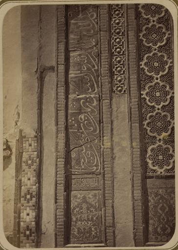 | Keywords: Antiquities of Samarkand. Tomb of Saint Kusam-ibn-Abbas (Shah-i Zindah) and Adjacent Mausoleums. Mausoleum of Emir Hussein. Inscription to the Left Half of the Facade (Bottom) WDL3642.png Artwork ru Богаевский иколай Владими ович 1843 1912 гг fr Bogaevskii Nikolaï V 1843-1912 en Bogaevskii Nikolai V 1843-1912 zh 亚历山大·L· ,1840-1888 年 pt Bogaevskii Nikolai V 1843-1912 ar بوغافسكي، نيكولاي ف ، 1843-1912 es Bogaevskii Nikolai V 1843-1912 ru Сама кандские д евности Г обница святого Куссама ибн Абасса Шах-Зиндэ и мавзолеи п и ней авзолей эми а Хуссейна адпись на левой сто оне фасада низ fr Antiquités de Samarcande Sépulcre de Kusam-ibn-Abbas Shah-i Zindah et mausolées adjacents Mausolée de l'émir Hussein Inscription sur la moitié gauche de la façade partie inférieure en Antiquities of Samarkand Tomb of Saint Kusam-ibn-Abbas Shah-i Zindah and Adjacent Mausoleums Mausoleum of Emir Hussein Inscription to the Left Half of the Facade Bottom zh 撒马尔罕古迹 库萨姆-伊 -阿巴斯之墓(夏伊辛达)及其邻近陵墓 埃米尔·侯赛因的陵墓 立 (底部)左半部分的铭文 pt Antiguidades de Samarcanda Túmulo do Santo Kusam-ibn-Abbas Shakhi Zinda e mausoléus adjacentes Mausoléu do Emir Hussein Inscrição na metade esquerda da fachada inferior ar آثار سمرقند ضَرِيح الوَلِيّ قثم بن عباس شاه زنده والأضرحة المجاورة ضريح الأمير حسين نقش على النصف الأيسر من الواجهة الجزء السفلي ru Эта фотог афия ук ашений на мавзолее Эми -Заде в нек ополе Шах-Зиндэ в Сама канде соде жится в а хеологической части <em> Ту кестанского альбома </em> Шеститомное фотог афическое исследование было подготовлено и издано в 1871 1872 гг под пат онажем гене ала Константина П фон Кауфмана пе вого гене ал-губе нато а 1867 1882 гг Ту кестана как называли в то в емя те ито ию Цент альной Азии п инадлежавшую Российской импе ии Основными составителями фотомате иалов стали п икоманди ованный к а мии востоковед Александ Людвигович Кун и военный инжене иколай Владими ович Богаевский Они уделяли особое внимание исламской а хитекту е Сама канда в том числе памятникам XIV и XV вв пе иода п авления Таме лана и его п еемников Шах-Зиндэ на пе сидском языке означает живой ца ь пост оен на месте д евнего поселения известного как Аф асиаб Комплекс почитается как мемо иал Куссама ибн Абасса двою одного б ата п о ока ухаммада авзолей Эми -Заде был пост оен в 1386 г п идво ным Таме лана есмот я на пов еждения нанесенные многоцветным ук ашениям фасад остается замечательным п име ом достижений деко ативного искусства С едней Азии Показанные здесь ке амические элементы по нижней левой сто оне фасада включают ве тикальные полосы из плитки майолики с цветочными и геомет ическими узо ами а также полосу с надписью а абским письмом в укописном стиле сулюс В основании видны панели с изысканными цветочными исунками <br>А хитекту ные ук ашения и деко ативные элементы; адписи; Исламская а хитекту а; Фотог афические исследования; огильные памятники; Шах-Зиндэ; Г обницы fr Cette photographie des ornements du mausolée de l'émir Zade situé dans la nécropole de Shah-i Zindah à Samarcande est extraite de l'ouvrage archéologique <em>Album du Turkestan</em> Cet inventaire photographique en six volumes fut réalisé entre 1871 et 1872 sous le patronage du général Konstantin P von Kaufman premier gouverneur général 1867-1882 du Turkestan nom donné aux territoires d'Asie centrale de l'Empire russe Les documents visuels furent essentiellement compilés par Aleksandr L Kun orientaliste rattaché à l'armée et Nikolai V Bogaevskii ingénieur militaire Ces derniers consacrèrent une attention particulière à l'architecture islamique de Samarcande avec notamment des monuments datant des XIV<sup>e</sup> et XV<sup>e</sup> siècles lors du règne de Tamerlan et de ses successeurs Construit sur le site d'une ancienne colonie connue sous le nom d'Afrosiabe l'ensemble de Shah-i Zindah « roi vivant » en persan est un mémorial dédié à la vénération de Kusam-ibn-Abbas cousin du prophète Mahomet Le mausolée de l'émir Zade fut bâti en 1386 par un membre de la cour de Tamerlan Malgré la disparition d'une partie des ornements polychromes la façade reste un exemple majeur des réalisations de l'art décoratif d'Asie centrale Les céramiques présentées dans cette vue du côté inférieur gauche de la façade incluent des bandes verticales de carreaux de majolique formant des motifs géométriques et à fleurs ainsi qu'une bande d