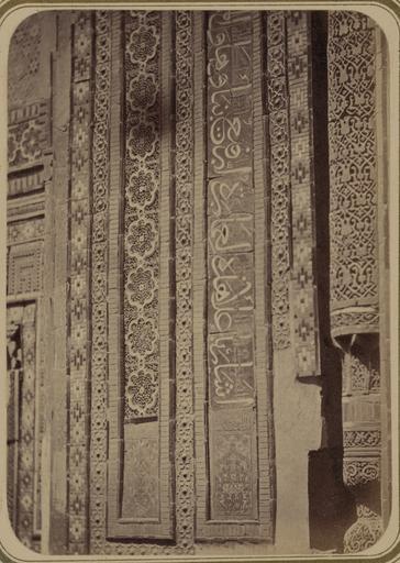 Keywords: Antiquities of Samarkand. Tomb of Saint Kusam-ibn-Abbas (Shah-i Zindah) and Adjacent Mausoleums. Mausoleum of Emir Hussein. Inscription on the Right Half of the Facade. Lower Section WDL3643.png Artwork ru Богаевский иколай Владими ович 1843 1912 гг fr Bogaevskii Nikolaï V 1843-1912 en Bogaevskii Nikolai V 1843-1912 zh 亚历山大·L· ,1840-1888 年 pt Bogaevskii Nikolai V 1843-1912 ar بوغافسكي، نيكولاي ف ، 1843-1912 es Bogaevskii Nikolai V 1843-1912 ru Сама кандские д евности Г обница святого Куссама ибн Абасса Шах-Зиндэ и мавзолеи п и ней авзолей эми а Хуссейна адпись на п авой половине фасада ижняя часть fr Antiquités de Samarcande Sépulcre de Kusam-ibn-Abbas Shah-i Zindah et mausolées adjacents Mausolée de l'émir Hussein Inscription sur la moitié droite de la façade Section inférieure en Antiquities of Samarkand Tomb of Saint Kusam-ibn-Abbas Shah-i Zindah and Adjacent Mausoleums Mausoleum of Emir Hussein Inscription on the Right Half of the Facade Lower Section zh 撒马尔罕古迹 库萨姆-伊 -阿巴斯之墓(夏伊辛达)及其邻近陵墓 埃米尔·侯赛因的陵墓 立 右半部分的铭文 下半段 pt Antiguidades de Samarcanda Túmulo do Santo Kusam-ibn-Abbas Shakhi Zinda e mausoléus adjacentes Mausoléu do Emir Hussein Inscrição na metade direita da fachada Seção inferior ar آثار سمرقند ضَرِيح الوَلِيّ قثم بن عباس شاه زنده والأضرحة المجاورة ضريح الأمير حسين نقش على النصف الأيمن من الواجهة الجزء السفلي ru Эта фотог афия ук ашений из ке амической плитки на мавзолее Эми -Заде в нек ополе Шах-Зиндэ в Сама канде соде жится в а хеологической части <em> Ту кестанского альбома </em> Шеститомное фотог афическое исследование было подготовлено и издано в 1871 1872 гг под пат онажем гене ала Константина П фон Кауфмана пе вого гене ал-губе нато а 1867 1882 гг Ту кестана как называли в то в емя те ито ию Цент альной Азии п инадлежавшую Российской импе ии В альбоме уделяется особое внимание исламской а хитекту е Сама канда в том числе памятникам XIV и XV вв пе иода п авления Таме лана и его п еемников Шах-Зиндэ на пе сидском языке означает живой ца ь пост оен на месте д евнего поселения известного как Аф асиаб Комплекс почитается как мемо иал Куссама ибн Абасса двою одного б ата п о ока ухаммада авзолей Эми -Заде был пост оен в 1386 г п идво ным Таме лана есмот я на пов еждения нанесенные многоцветным ук ашениям фасад остается замечательным достижением деко ативного искусства С едней Азии а фотог афии видна нижняя п авая часть главного фасада по кото ой идут ве тикальные полосы из плитки майолики с цветочными и геомет ическими узо ами а также полоса с надписью а абским письмом в укописном стиле сулюс В основании видны панели с изысканными цветочными исунками С левого к ая азличима ниша по тала С п авого к ая находится нижняя часть колонны из глазу ованной те акоты в левом углу мавзолея Шади- ульк <br>А хеологические объекты; А хитекту ные ук ашения и деко ативные элементы; адписи; Исламская а хитекту а; Фотог афические исследования; огильные памятники; Шах-Зиндэ; Г обницы fr Cette photographie des ornements en carreaux de céramique du mausolée de l'émir Zade situé dans la nécropole de Shah-i Zindah à Samarcande est extraite de l'ouvrage archéologique <em>Album du Turkestan</em> Cet inventaire photographique en six volumes fut réalisé entre 1871 et 1872 sous le patronage du général Konstantin P von Kaufman premier gouverneur général 1867-1882 du Turkestan nom donné aux territoires d'Asie centrale de l'Empire russe L'album consacre une attention particulière à l'architecture islamique de Samarcande avec notamment des monuments datant des XIV<sup>e</sup> et XV<sup>e</sup> siècles lors du règne de Tamerlan et de ses successeurs Construit sur le site d'une ancienne colonie connue sous le nom d'Afrosiabe l'ensemble de Shah-i Zindah « roi vivant » en persan est un mémorial dédié à la vénération de Kusam-ibn-Abbas cousin du prophète Mahomet Le mausolée de l'émir Zade fut bâti en 1386 par un membre de la cour de Tamerlan Malgré la disparition d'une partie des ornements polychromes la façade reste une réalisation majeure de l'art décoratif d'Asie centrale Cette vue de la partie inférieure droite de la façade principale présente des bandes verticales de carreaux de majolique formant des motifs géométriques et à fleurs ainsi qu'une bande d'inscription ornée d'une écriture cursive arabe en style thoulouth la base de la façad