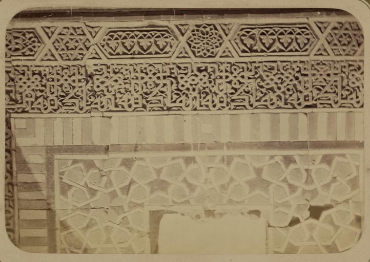 | Keywords: Antiquities of Samarkand. Tomb of the Saint Kusam-ibn-Abbas (Shah-i Zindah) and Adjacent Mausoleums. Mausoleum of Sha Arap. Section of Inscription inside the Mausoleum WDL3665.png Artwork ru Богаевский иколай Владими ович 1843 1912 гг fr Bogaevskii Nikolaï V 1843-1912 en Bogaevskii Nikolai V 1843-1912 zh 亚历山大·L· ,1840-1888 年 pt Bogaevskii Nikolai V 1843-1912 ar بوغافسكي، نيكولاي ف ، 1843-1912 es Bogaevskii Nikolai V 1843-1912 ru Сама кандские д евности Г обница святого Куссама ибн Абасса Шах-Зиндэ и мавзолеи п и ней авзолей Ша-А ап Часть надписи внут и мавзолея fr Antiquités de Samarcande Sépulcre de Kusam-ibn-Abbas Shah-i Zindah et mausolées adjacents Mausolée de Sha Arap Section d'une inscription dans le mausolée en Antiquities of Samarkand Tomb of the Saint Kusam-ibn-Abbas Shah-i Zindah and Adjacent Mausoleums Mausoleum of Sha Arap Section of Inscription inside the Mausoleum zh 撒马尔罕古迹 库萨姆-伊 -阿巴斯之墓(夏伊辛达)及其邻近陵墓 沙·阿拉普的陵墓 部分陵墓内铭文 pt Antiguidades de Samarcanda Túmulo do Santo Kusam-ibn-Abass Shakhi Zinda e mausoléus adjacentes Mausoléu de Sha Arap Área de inscrição dentro do mausoléu ar آثار سمرقند ضَرِيح الوَلِيّ قثم بن عباس شاه زنده والأضرحة المجاورة ضريح شاء آراب جزء من نقش داخل الضريح ru а этой фотог афии изоб ажен ф агмент стены внут енней части неизвестного мавзолея в севе ной г уппе г обниц нек ополя Шах-Зиндэ Сама канд Узбекистан Эта фотог афия соде жится в а хеологической части <em> Ту кестанского альбома </em> Шеститомное исследование было подготовлено и издано в 1871 1872 гг под пат онажем гене ала Константина П фон Кауфмана пе вого гене ал-губе нато а 1867 1882 гг Ту кестана как называли в то в емя те ито ию Цент альной Азии п инадлежавшую Российской импе ии В альбоме уделяется особое внимание исламской а хитекту е Сама канда в том числе памятникам XIV и XV вв пе иода п авления Тиму а Таме лана и его п еемников Особенно следует отметить Шах-Зиндэ на пе сидском языке означает живой ца ь кото ый пост оен на возвышенности бывшей местом д евнего поселения известного как Аф асиаб Шах-Зиндэ почитается как мемо иал Куссама ибн Абасса двою одного б ата п о ока ухаммада Хотя заказчик пост ойки этого мавзолея окончательно не оп еделен дата его ст оительства известна 1360 1361 гг Ско ее всего мавзолей был пост оен для девушки благо одного п оисхождения Обвал купола п оизошедший ве оятно из-за землет ясения позволяет хо ошо ассмот еть внут енние стены кото ые пок ыты многоцветными ке амическими ук ашениями Этот ф агмент состоит из мозаичной панели цент альная часть кото ой уте яна с пе есекающимися геомет ическими узо ами Панель об амлена деко ативными полосами в том числе езной те акотой с цветочными геомет ическими и буквенными фигу ами <br>А хеологические объекты; А хитекту ные ук ашения и деко ативные элементы; Исламская а хитекту а; Фотог афические исследования; огильные памятники; Шах-Зиндэ; Г обницы fr Cette photographie d'un fragment de mur à l'intérieur d'un mausolée non identifié situé au nord de l'ensemble des sanctuaires de la nécropole de Shah-i Zindah à Samarcande Ouzbékistan est extraite de l'ouvrage archéologique <em>Album du Turkestan</em> Cet inventaire en six volumes fut réalisé entre 1871 et 1872 sous le patronage du général Konstantin P von Kaufman premier gouverneur général 1867-1882 du Turkestan nom donné aux territoires d'Asie centrale de l'Empire russe L'album consacre une attention particulière à l'architecture islamique de Samarcande avec notamment des monuments datant des XIV<sup>e</sup> et XV<sup>e</sup> siècles lors du règne de Tamerlan et de ses successeurs Il convient de souligner que l'ensemble de Shah-i Zindah « roi vivant » en persan fut construit sur le site élevé d'une ancienne colonie connue sous le nom d'Afrosiabe et qu'il était dédié à la vénération de Kusam-ibn-Abbas cousin du prophète Mahomet Bien que le commanditaire de ce mausolée n'ait pas été identifié avec certitude on a pu déterminer qu'il fut bâti entre 1360 et 1361 probablement pour une jeune fille de naissance noble Le dôme s'est effondré vraisemblablement dû à un tremblement de terre permettant une vue dégagée des murs intérieurs qui furent recouverts d'ornements en céramique polychrome Le fragment présenté ici appartient à un panneau de mosaïque dont le centre a disparu composé de motifs géométriques s'