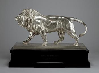 Keywords: Antoine-Louis Barye - Walking Lion; Striding Lion (Racing Trophy) - Walters 27167 - Profile.jpg Roger Ballu Barye's first biographer relates how In 1865 at the Grand Prix de Paris a horse race held at Longchamps the French filly Fille de l'Air Daughter of the Wind defeated the English entry He continues noting that Napoleon III personally presented this silver racing trophy to Count Frederic de Lagrange the owner of the winning horse Barye received a commission of 10 000 francs for this enlarged version of Walking Lion a subject that had first been cast about 1840 The problem with Ballu's account is that Lagrange's Gladiateur won the Grand Prix in 1865 after having won the Triple Crown in England being the first foreign horse to do so The Fille de l'Air a filly also owned by Lagrange won the Epsom Derby in 1864 Presumably the marble plinth with the inscription identifying Fille de l'Air as the 1865 winner was cut long after 1865 when a confusion arose as to the exact history of the event La Fille de l'Air did win La Coupe at Longchamp in 1865 It is a group 3 race 1865 silver on marble plinth cm 49 5 67 9 22 2 accession number 27 167 30333 J Montaignac William T Walters Baltimore January 30 1885 by purchase George A Lucas as agent Henry Walters city Baltimore Walters Art Museum Henry Walters Acquired by William T Walters 1885 Signature Cast through from model BARYE; Date Incised in gold letters on black marble plinth PARIS 30 AVRIL 1865/ FILLE D'AIR; Number Painted on plinth W 49 The Works of Antoine-Louis Barye American Art Gallery New York New York 1889-1890 A Baltimorean in Paris George A Lucas 1860-1909 The Walters Art Gallery Baltimore 1979 The Taste of Maryland Art Collecting in Maryland 1800-1934 The Walters Art Gallery Baltimore 1984 Bronze Animaliers Arnot Art Museum Elmira 1985 A Magnificent Age Masterpieces from the Walters Art Museum Baltimore The Nelson-Atkins Museum of Art Kansas City; Mint Museum of Art Charlotte; The Walters Art Museum Baltimore 2002-2004 Untamed The Art of Antoine-Louis Barye The Walters Art Museum Baltimore; Philbrook Museum of Art Tulsa; The Henry Morrison Flagler Museum Palm Beach 2007-2008 Lost and Found The Secrets of Archimedes The Walters Art Museum Baltimore 2011-2012 place of origin Paris France Walters Art Museum license Sculptures by Antoine-Louis Barye Media contributed by the Walters Art Museum needs category review Sculptures in the Walters Art Museum Sculptures of lions Trophies Grand Prix de Paris flat horse racing 1865