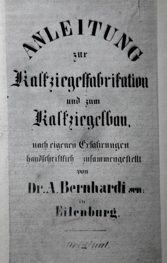 Keywords: Anton Bernhardi Patentschrift Titelblatt.jpg Anleitung Dr Anton Bernhardis zur Kalkziegelfabrikation Die Archive des Kreises Eilenburg Hrsg Arbeitsgemeinschaft der Archivare des Kreises Eilenburg o J vor 1990 um 1856 Anton Bernhardi 1813-1889 Anton Bernhardi PD-old