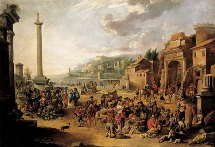 | Keywords: Anton Goubau - A market in an Italianate harbour with Diogenes.jpg Artwork creator Anton Goubau 1666 oil canvas cm 163 2 228 4 object history Sir A P Gordon Cumming Altyre Scotland; Sotheby's London 26 March 1952 lot 23 credit line accession number Christie's online 2030143 6434 54 London 25 April 2001 PD-old-100 Anton Goubau Bamboccianti 1666 paintings Diogenes in paintings Paintings of markets Diogenes of Sinope looking for a man 17th-century paintings location missing Oil paintings of ports and harbours |