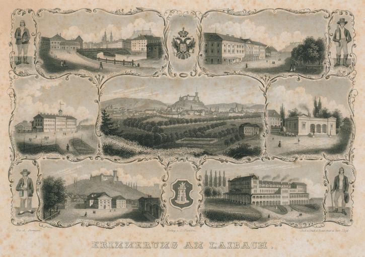 | Keywords: Anton Jurmann - Erinnerung an Laibach (1850).jpg en Erinnerung an Laibach Memory of Ljubljana a collage of Ljubljana from 1850 17 x 24 cm 27O553U5 Anton Jurmann 1850 PD-art-100 ImageNote 1 3423 999 1014 996 4636 3273 2 The guardhouse of the National Guard<br /> 200px left ImageNoteEnd 1 ImageNote 2 489 145 1572 811 4636 3273 2 St Mary's Square now Prešeren Square with Franz's Bridge<br /> 200px left ImageNoteEnd 2 ImageNote 3 532 2035 1514 807 4636 3273 2 Congress Square and the Estates Theatre<br /> 200px left ImageNoteEnd 3 ImageNote 4 1315 985 1999 1028 4636 3273 2 View of Ljubljana from Tivoli Park<br /> thumb left ImageNoteEnd 4 ImageNote 5 2527 2028 1634 846 4636 3273 2 Kolizej Austrian barracks <br /> thumb 200px left ImageNoteEnd 5 ImageNote 6 2532 139 1663 846 4636 3273 2 Kazina Congress Square<br /> thumb left 200px ImageNoteEnd 6 ImageNote 7 191 996 1066 1002 4636 3273 2 Ljubljana Train Station<br /> left 200px ImageNoteEnd 7 19th-century drawings of Ljubljana 1850 in Ljubljana Coats of arms of Ljubljana Guardhouses in Slovenia 19th-century images of Prešeren Square 19th-century images of Congress Square Historical images of Tivoli City Park Historical images of Kolizej Palace Clothing of Slovenia 19th-century images of the Casino Building Ljubljana 19th-century views of Ljubljana Castle from Tivoli City Park Historical images of the main building of Ljubljana Train Station Estates Theatre 19th-century images of buildings in Ljubljana Anton Jurmann |