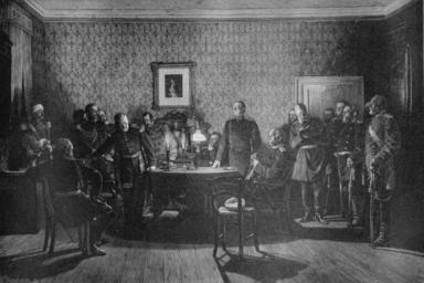 Keywords: Anton von Werner, Kapitulations-Verhandlungen von Sedan (19. Jhdt., Schwarz-Weiß-Version).png author after Die deutsch-französischen Kapitulationsverhandlungen am 2 September 1870 Deutscher Verhandlungsführer ist Otto Graf von Bismarck 1815 “1898 A depiction of the talks in the village of w Donchery Ardennes department Ardennes France on 1870 09 02 hours after the French Army of Châlons had run up a white flag over Sedan Ardennes Sedan Members of the French delegation pictured on the left Supreme Commander Emmanuel Félix de Wimpffen just standing up General Auguste-Alexandre Ducrot and other officers Members of the delegation from the Prussian Coalition pictured on the right Supreme Commander Helmuth von Moltke the Elder standing at the table Otto von Bismarck sitting to Moltke's left Field Marshall Germany General Field Marshall Leonhard Graf von Blumenthal General Field Marshall Alexander August Wilhelm von Pape commanders of the 3rd- and the Maas-Army and other officers after 1870-09-02 oil canvas accession number object history credit line Cite book Theodor H Lindner Der krieg gegen Frankreich und die einigung Deutschlands Zur 25 jährigen wiederkehr der gedenktage von 1870/1871 Berlin A Asher Co 1895 23801082 other versions 100x100px Anton von Werner Kapitulations-Verhandlungen von Sedan 19 Jhdt jpg PD-old Paintings by Anton von Werner Auguste-Alexandre Ducrot Napoléon III surrenders 1870 Helmuth von Moltke the Elder Light in art Shadows in art |