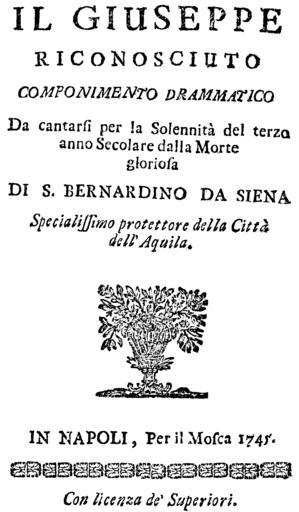 | Keywords: Antonio Ferradini - Il Giuseppe riconosciuto - titlepage of the libretto - Naples 1745.png en Antonio Ferradini - Il Giuseppe riconosciuto - titlepage of the libretto - Naples 1745 1745 https //archive org/details/ilgiuseppericono00ferr Pietro Metastasio Antonio Ferradini other versions PD-old-70-1923 Uploaded with UploadWizard Giuseppe riconosciuto Antonio Ferradini | ||||
