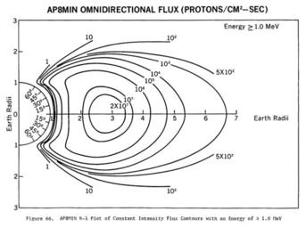 Keywords: Ap8-omni-1.000MeV.png en Omnidirectional integral flux of protons >1MeV in the Van Allen belts AP8 Trapped Proton Environment for Solar Maximum and Solar Minimum US National Space Data Center 1976-12 PD-USGov Check categories 2009 April 24 en wikipedia Van_Allen_radiation_belt Earth Meteorology Space 3 Van Allen radiation belts |