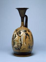 | Keywords: Apollonia Painter - Red-Figure "Kerch"-Style Lekythos - Walters 4884 - Right.jpg This vase is an exquisite example of the Kerch ware distinguished by graceful poses delicate details gilding and abundant colors The subject is games of love A seated nymph triumphs at knucklebones a game in which both players toss bones from the ankle of a sheep into the air and try to catch them on the back of their hand Her unsuccessful opponent is a satyr Behind him stands Aphrodite between two Eros figures who are offering laurel wreaths of victory to the nymph and to the youth at far left dressed as a bridegroom ca 350 BC Classical terracotta cm 35 5 16 7 accession number 48 84 15102 Prince Boris Chakhoskoy consul or vice-consul of Russia at Bourges 1884-85 found in Apollonia Thrace A van Branteghem date and mode of acquisition unknown N M Pacha date and mode of acquisition unknown Henry Walters Baltimore 1906 mode of acquisition unknown Walters Art Museum Henry Walters Acquired by Henry Walters 1906 The Taste of Maryland Art Collecting in Maryland 1800-1934 The Walters Art Gallery Baltimore 1984 From Alexander to Cleopatra Greek Art of the Hellenistic Age The Walters Art Gallery Baltimore 1988-1989 Things With Wings Mythological Figures in Ancient Greek Art The Walters Art Museum Baltimore 2005-2006 Things With Wings Mythological Figures in Ancient Greek Art Ward Museum Salisbury 2009 place of origin Athens Greece Walters Art Museum license Ancient Greek red-figure pottery in the Walters Art Museum Apollonia Painter Squat lekythoi Knucklebones in art Gilded vases |