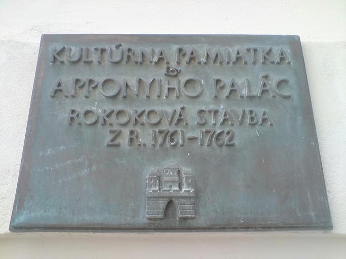 | Keywords: Aponiho palác table.jpg 101-189/0 Plaque on the Apponyis' palace Radničná Bratislava; The sign reads Cultural monument; Apponyi's palace; rococo building from years 1761-1762 Emléktábla az Apponyi-palota falán Pozsony; A felirat magyar fordítása Kulturális műemlék;Apponyi-palota;rokokó építmény az 1761-1762-es évekből Pamätná tabuľa na paláci Apponyiovcov Radničná Bratislava Tafel am Aponiho Palais Radnicá Bratislava Own 2008-04 Wizzard Own work all rights released Public domain Aponiho Palace in Bratislava Plaques in Bratislava Signs of cultural heritage monuments in Slovakia |