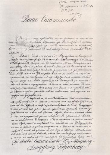 | Keywords: Appeal-from-Pirot-citizens-to-Dondukov-Korsakov-27may1878.jpg олба за освобождение от жителите на г ад Пи от до княз Дондуков-Ко саков 27 май 1878 пъ ва ст аница Текст Ваше Сиятелство Възбудени отъ п Unicode гол м ѫ -т ѫ ни адость за п истига- нiе-то <nowiki>Ви</nowiki> въ Пловдивъ дъ знахме да Ви отп авимъ настоiа- ште-то <nowiki>писмо</nowiki> ч зъ кое-то да Ви честитiаваме постъ-тъ като главенъ уп авитель на ново-освободен ѫ -т ѫ ни майк ѫ Бъл- га иi ѫ Ваше Сиятелство Въ ху Васъ iе възложилъ егово Импе ато ско Величество Александ ъ ІІ<sup> и</sup> аший Освободитель г ижiа-та за попеченiе-то на бълга ски-т инте еси; Вамъ ie дадена в ѫ ц с ѫ дба-та на бълга скiа на- одъ и Вамъ занап дъ се налага длъжность-та да заштишта- вате вс ко ъгълче на Бълга иi ѫ кога-то бы пос гн ѫ ль н кой не- п иiатель на п авдины-т му П дъ Васъ т бва вс кой iединъ г адъ или вс ко iедно село на Бълга иi ѫ да искаже свои-т м ѫ кы и ст аданиiа А като iе тъй молиме Ви най- поко но отст ѫ пете iеднъ часть отъ Ваше-то челов колюб- но съ це и чуйте дълбоки-т ни ст нанiа подъ iа ема на чуждо-то уп авленiе ад iемъ се че сте ся изв стиле вечъ отъ наши- т п дставители които стоiатъ отъ толкова в ме на насамъ въ Софиi ѫ и които п ис ѫ тствуваха въ Санс Стефано че ний досега сме дали доста п отести п отивъ зло-то у- п авлениiе на нашит б атiа Сь би кои-то искатъ съ си- л ѫ т ѫ на о ѫ жиiето да ни нака атъ да п ом ниме свiата- та си на одность бълга ск ѫ и да се на чеме за т хн ѫ полс ѫ чисти Сь би като се отд лимъ отъ майк ѫ -т ѫ ни Бълга иi ѫ коiа- то ни iе одила и до сега отх анила и коiато съ земиi ѫ -т ѫ си пок ива очит на усопши-т ни д ди и п д ди Тежка ште б ѫ де майчина-та ни кл тва ако се ми откажемъ отъ неi ѫ и затуй на никой начинъ не можемъ да п иемеме въ ху ни До егово Сиiателство Г-ну Гене алу Дондукову-Ко сакову Scanned from History of Bulgaria Bulgarian Academy of Sciences Исто ия на Бълга ия Том 7 Бълга ия 1878 - 1903 Издателство на БА София 1991 ст 423 1878-05-27 Pirot Bulgarian Municipality Public domain PD-old Historical documents of Bulgaria Historical documents of Serbia History of modern Serbia History of Pirot 1878 Manuscript letters written messages 1878-05-27 Aleksandr Dondukov-Korsakov |