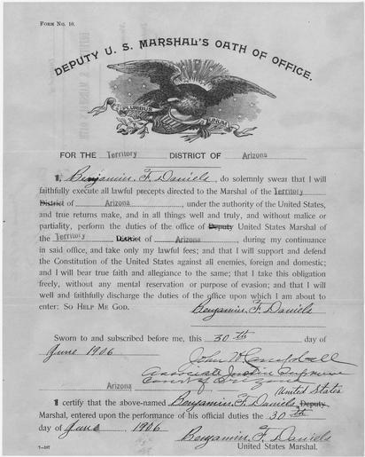 | Keywords: Appointment and Oath of Office for Benjamin Daniels as Marshal in the Territory of Arizona. - NARA - 295693.tif Scope and content General notes 295693 Local identifier NARA's Pacific Region Riverside NRHAR 23123 Cajalco Rd Perris CA 92570 1906-06-30 Record group Record Group 527 Records of the U S Marshals Service 1864 - 1992 Record group ARC 764 Appointments and Oaths of U S Marshals and Deputy Marshals compiled 1864 - 1912 Series ARC 295651 File unit File unit ARC Variant control numbers NAIL Control Number NRHL-527-AZ1-42 yes Other versions NARA-cooperation PD-USGov Check categories-NARA 2011 September 13 Documents in English |