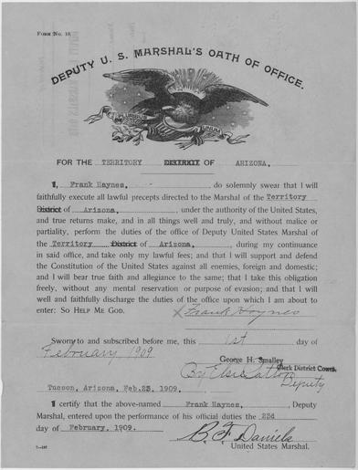 | Keywords: Appointment and Oath of Office for Frank Haynes as Deputy Marshal in the Territory of Arizona. - NARA - 295746.tif Scope and content General notes 295746 Local identifier NARA's Pacific Region Riverside NRHAR 23123 Cajalco Rd Perris CA 92570 1909-02-23 Record group Record Group 527 Records of the U S Marshals Service 1864 - 1992 Record group ARC 764 Appointments and Oaths of U S Marshals and Deputy Marshals compiled 1864 - 1912 Series ARC 295651 File unit File unit ARC Variant control numbers NAIL Control Number NRHL-527-AZ1-95 yes Other versions NARA-cooperation PD-USGov Check categories-NARA 2011 September 13 Documents in English |
