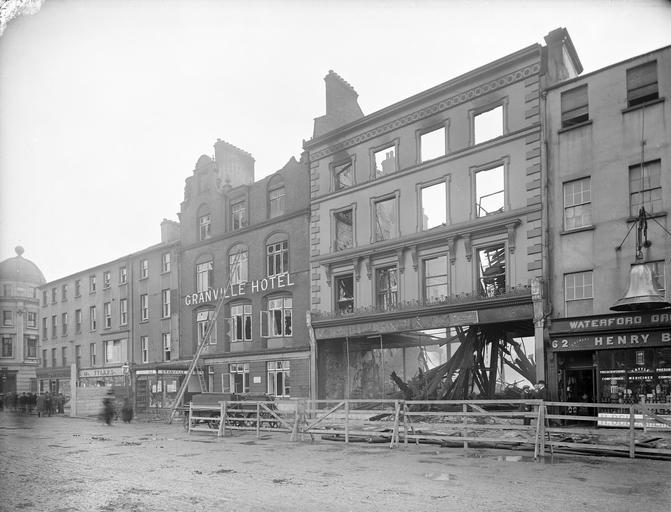 | Keywords: hearne & co. hearneco hearne's hearnes ireland munster fire rubble girders burnt gormans medical hall gormansmedicalhall tylers boots tylersboots tylers boots are right every way tylersbootsarerighteveryway granville hotel granvillehotel the granville thegranville henry bell henrybell bell's chemist bellschemist chemist pharmacy prescriptions compounded prescriptionscompounded cattle medicines cattlemedicines mellins food mellinsfood monday 12th april 1915 1910s a.h. poole ahpoole poole collection poolecollection arthur henri poole arthurhenripoole glass negative glassnegative barriers ladders meagher's quay meaghersquay shops hotel fire pumps firepumps hand-powered fire pumps handpoweredfirepumps waterford national library of ireland nationallibraryofireland blackandwhite monochrome building architecture outdoor building complex black and white A row of buildings on Meagher's Quay in Waterford, pictured 10 days after a fire caused the devastation evident in this photo (the other side of Hearne's which stretched through to George's Street. We can see here that the building has been completely gutted, but as Subpopulus Hibernia points out: "It's also pretty impressive that the facade remains intact. I wonder if it was supported by a steel girder... I'm not sure how often such building techniques would have been employed in provinical Irish cities at the turn of the century." Date: Monday, 12 April 1915 NLI Ref.: P_WP_2608 A row of buildings on Meagher's Quay in Waterford, pictured 10 days after a fire caused the devastation evident in this photo (the other side of Hearne's which stretched through to George's Street. We can see here that the building has been completely gutted, but as Subpopulus Hibernia points out: "It's also pretty impressive that the facade remains intact. I wonder if it was supported by a steel girder... I'm not sure how often such building techniques would have been employed in provinical Irish cities at the turn of the century." Date: Monday, 12 April 1915 NLI Ref.: P_WP_2608 |