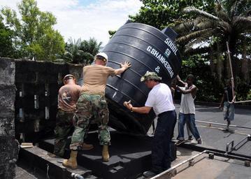 Keywords: APS Helps Local Sierra Leone Hospitals DVIDS213517.jpg en Africa Partnership Station construction personnel embarked aboard the Africa Partnership Station platform HNLMS Johan de Witt remount a water tower after completing a roofing project at the Bai Bureh Memorial Community Hospital here Oct 15 More than 30 Dutch Royal Marines and Sailors from the Dutch amphibious ship HNLMS Johan De Witt along with 5 U S Navy Seabees from Naval Mobile Construction Battalion 3 who are embarked on the ship went to work in Lungi in order to make repairs at the hospital After the projects were fixed the team also instructed the hospital staff on proper maintenance and emergency repair procedures to allow the staff to be able to deal with any problems in the future Johan De Witt a Royal Dutch Naval vessel is the first European-led APS platform and is augmented by staff from Belgium Portugal and the United States APS originally a U S Navy initiative is now an international effort aimed at improving maritime safety and security for the continent of Africa through training and other collaborative activities with African partner countries 2009-10-15 Chief Petty Officer Jason Morris https //www dvidshub net/image/213517 091015-N-+++++-129 2009-10-16 09 24 LUNGI SL PD-USGov-Military-Navy United States Navy Seabees Naval Mobile Construction Battalion 3 Images from DoD uploaded by Fæ