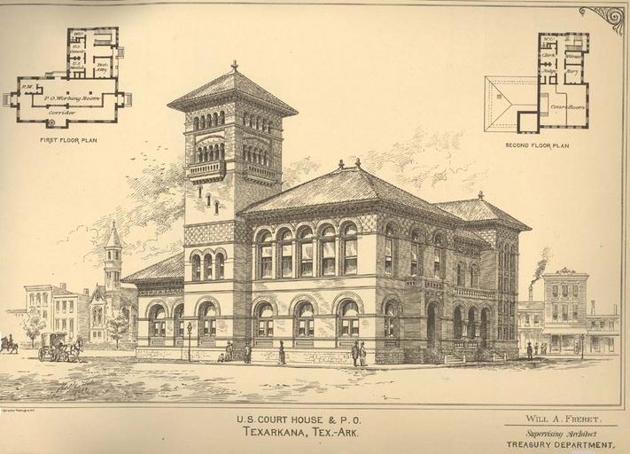 | Keywords: AR-Texarkana RSA 1888-s.jpg en Texarkana Texas U S Court House and Post Office 1889; 1901 Completed in 1892 Supervising Architect Willoughby J Edbrooke The U S District Court for the Eastern District of Texas met here from 1903 until 1911; the U S Circuit Court for the Eastern District of Texas met here from 1903 until 1911; the U S District Court for the Eastern District of Arkansas met here until the 1897 reorganization of the Arkansas judicial districts; the U S District Court for the Western District of Arkansas met here from 1897 until 1930; the U S Circuit Court for the Eastern District of Arkansas met here until the 1897 reorganization of the Arkansas judicial districts; the U S Circuit Court for the Western District of Arkansas met here from 1897 until that court was abolished in 1912 Razed in 1930 U S Treasury Department Annual Report of the Supervising Architect of the Treasury Department for the Calendar Year Ending December 31 1888 Washington D C GPO 1889 ; available at http //www fjc gov/history/courthouses nsf/lookup/AR-Texarkana_1892_Ref jpg/ file/AR-Texarkana_1892_Ref jpg U S Treasury Department 1888 PD-USGov Images from the US Federal Judicial Center database Texarkana Federal courthouses in Texas Former federal courthouses in the United States Built in Texas in 1892 1888 in Texas Willoughby J Edbrooke |