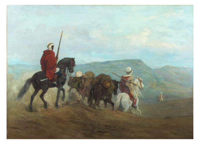 | Keywords: Arab Horse Soldiers - Spahis.jpg Spahis cavaliers descending a declivity in the desert and a man on foot driving two laden mules The bright light and subject matter is characteristic of the Orientalist movement a 19th-century phenomenon which pervaded French art by combining elements of Romanticism such as the attraction to distant and Middle East settings and Realism in the objective rendering of the figures 1871 painted oil on canvas size cm 76 2 105 Weight 31 5kg with frame size cm 101 135 Institution Victoria and Albert Museum London within the institution Paintings room 81 case WEST WALL exhibition history 19th-century French art is marked by a succession of movements based on a more or less close relationship with nature At the beginning of the century Romantic artists were fascinated by nature they interpreted as a mirror of the mind They investigated human nature and personality the folk culture the national and ethnic origins the medieval era the exotic the remote the mysterious and the occult This movement was heralded in France by such painter as Eugène Delacroix 1798-1863 In its opposition to academic art and its demand for a modern style Realism continued the aims of the Romantics They assumed that reality could be perceived without distortion or idealization and sought after a mean to combine the perception of the individual with objectivity This reaction in French painting against the Grand Manner is well represented by Gustave Courbet 1819-1877 who wrote a 'Manifesto of Realism' entitled Le Réalisme published in Paris in 1855 These ideas were challenged by the group of the Barbizon painters who formed a recognizable school from the early 1830s to the 1870s and developed a free broad and rough technique They were mainly concerned by landscape painting and the rendering of light The works of Narcisse Virgile Diaz de la Peña 1807-1876 Jules Dupré 1811-1889 Théodore Rousseau 1812-1867 Constant Troyon 1810-1865 and Jean-François Millet 1814-1875 anticipate somehow the plein-air landscapes of the Impressionists object history Commissioned by Constantine Alexander Ionides from the artist Titled <u>Spahis</u> it entered Ionides' collection after October 1873 cf letters dated March to October 1873 private collection ; listed in Ionides' inventory of November 1881 as 'Cavaliers Arabes' by Regamey with a valuation of £100; bequeathed by Constantine Alexander Ionides 1900 Historical significance This painting shows three Arab horsemen descending a declivity in the desert Such cavalry were known as spahi and were also found in French colonial regiments They were a common theme in Régamey's oeuvre which principally comprised depictions of horses and horsemen He does not seem to have visited Africa but made many sketches of Arab horsemen probably after other artists' designs His visual memory was said to be considerable and enabled him to recreate details and compositional formulae in his atelier This painting was commissioned by Constantine Alexander Ionides from the artist whom he had probably met through the intermediary of Legros during the winter 1870-71 At that time Régamey was contributing to the Illustrated London News Although the painting is signed and dated 1871 letters from the artist in Paris to Constantine Alexander Ionides dated between March and October 1873 private collection suggest that it was still unfinished in October 1873 Régamey made at least two preparatory studies for this painting a sketch in pastel in the Musée d'Orsay Paris RF29262 dated 14th March 1871 and another in pen and ink Musée du Louvre RF 29273 credit line 'Regamey Guillaume 71' Landscape with bare hills In the foreground are two Arab horsemen with red cloaks and between them a man on foot driving two laden mules The party is descending a declivity towards the spectator's right and is preceded at a distance by another horseman accession number CAI 73 http //collections vam ac uk/item/O81376/oil-painting-arab-horse-soldiers-spahis/ collections vam ac uk PD-old-100 Arabs Guillaume Régamey 19th-century paintings Cavalry of the Islamic World Spahis |